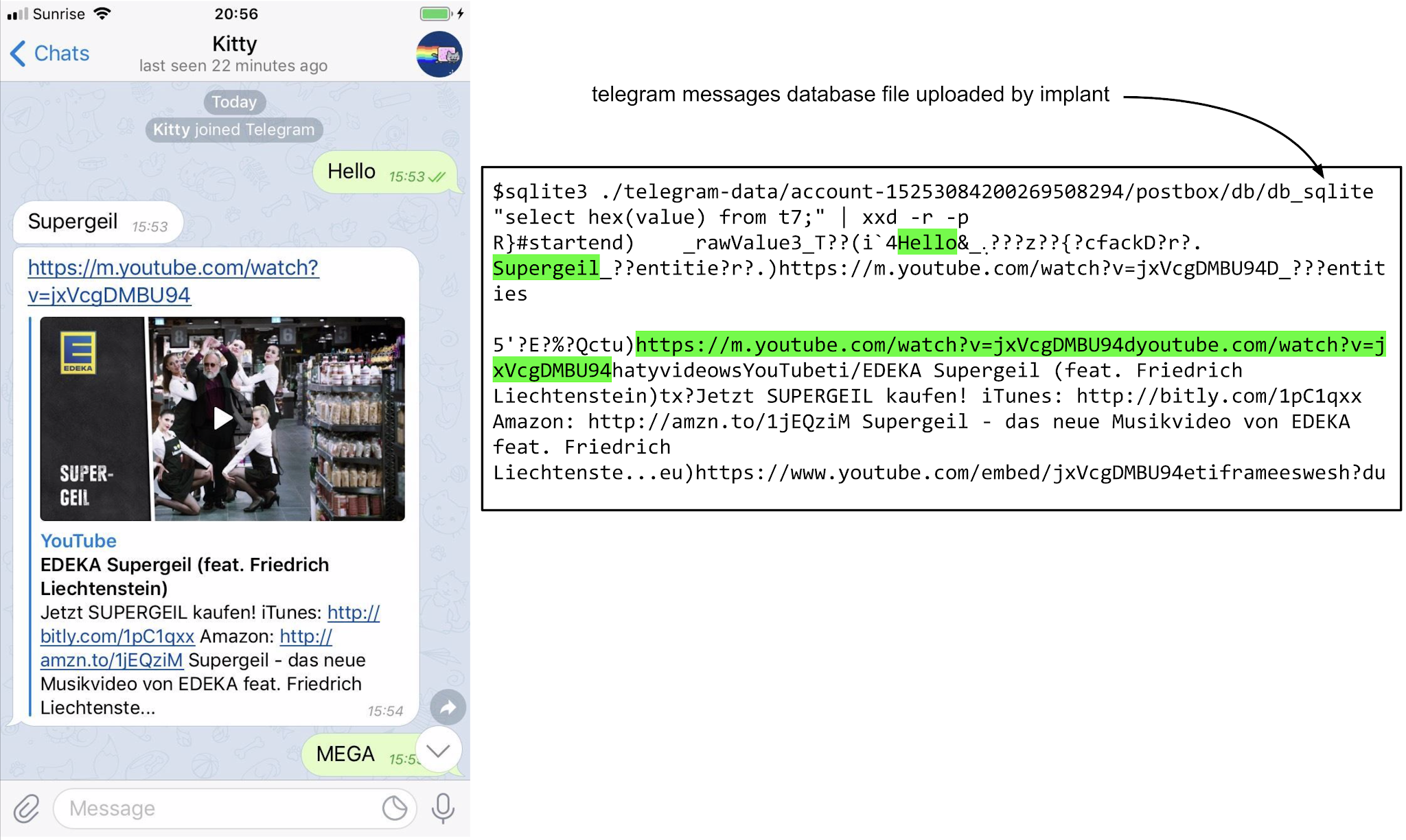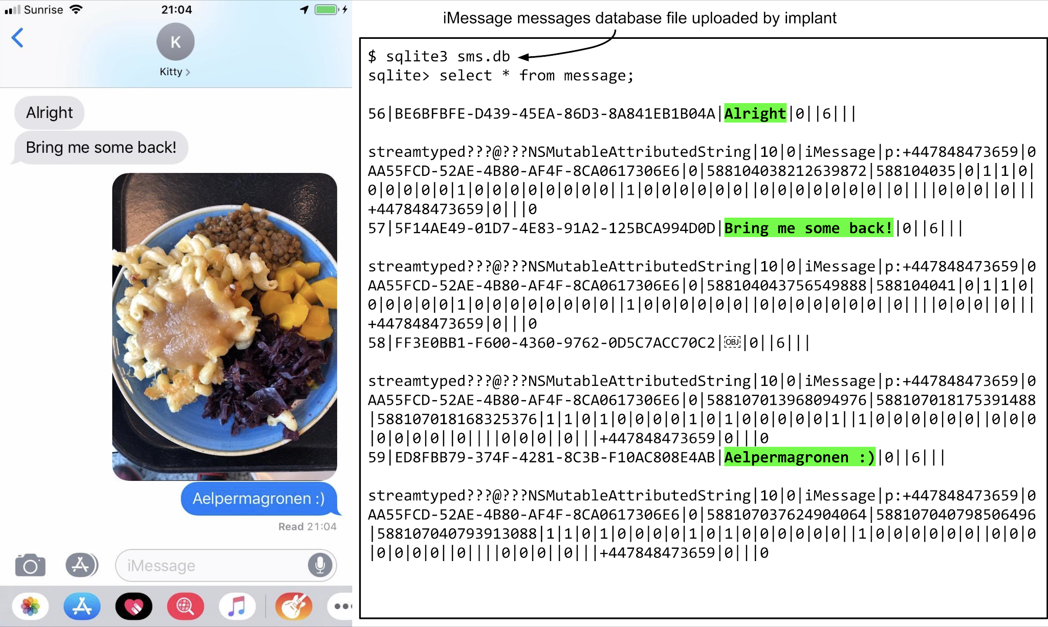 The implant has access to all the database files (on the victim’s phone) used by popular end-to-end encryption apps like Whatsapp, Telegram and iMessage. We can see here screenshots of the apps on the left, and on the right the contents of the database files stolen by the implant which contain the unencrypted, plain-text of the messages sent and received using the apps: