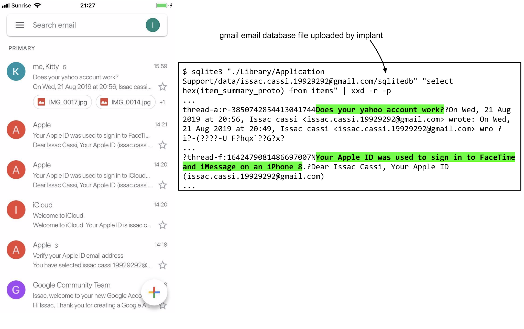 The implant can upload private files used by all apps on the device; here's an example of the plaintext contents of emails sent via Gmail, which are uploaded to the attacker's server: