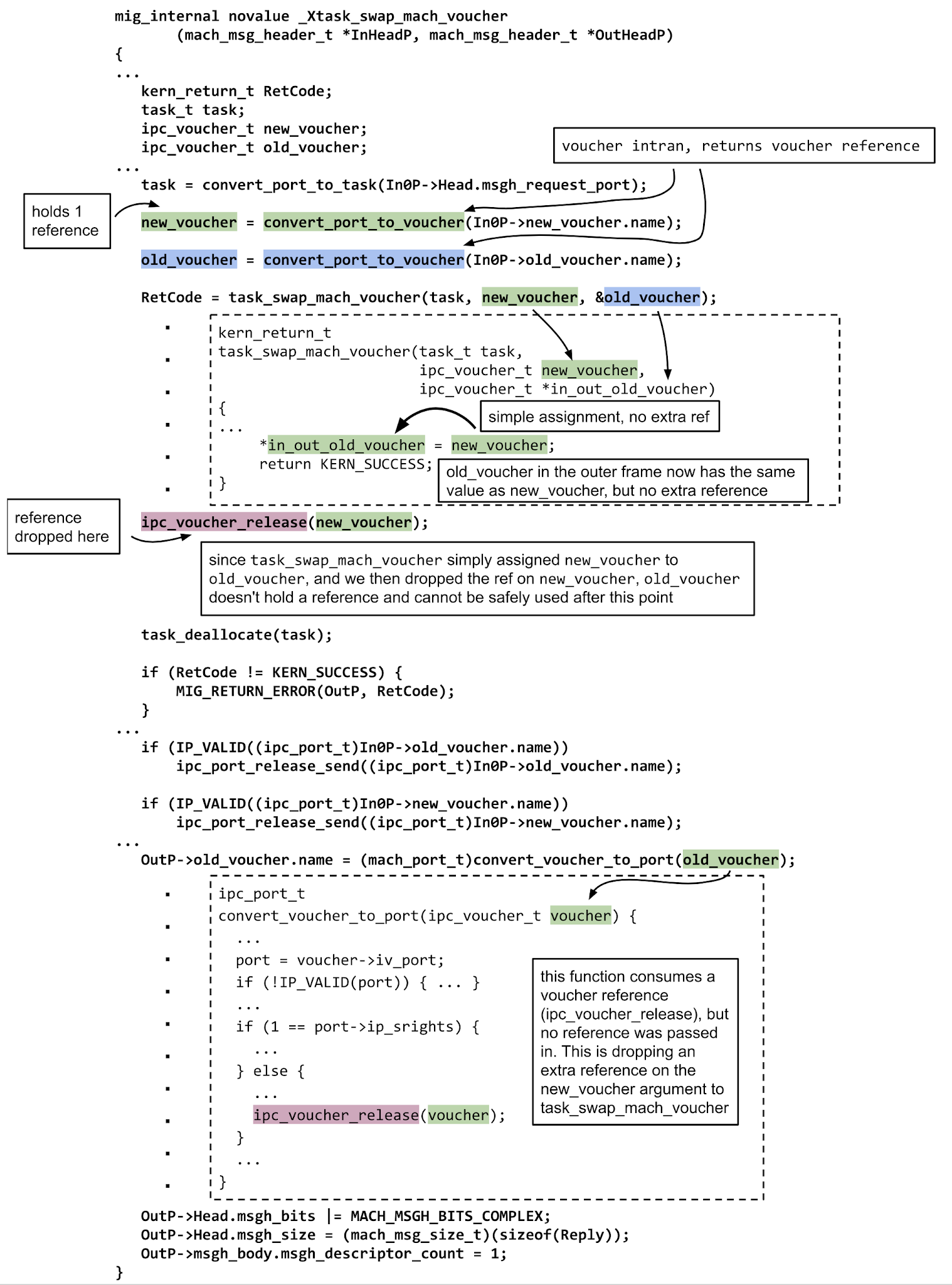 To see why there's actually a bug here, we need to look one level deeper at the MIG auto-generated code which calls task_swap_mach_voucher:
