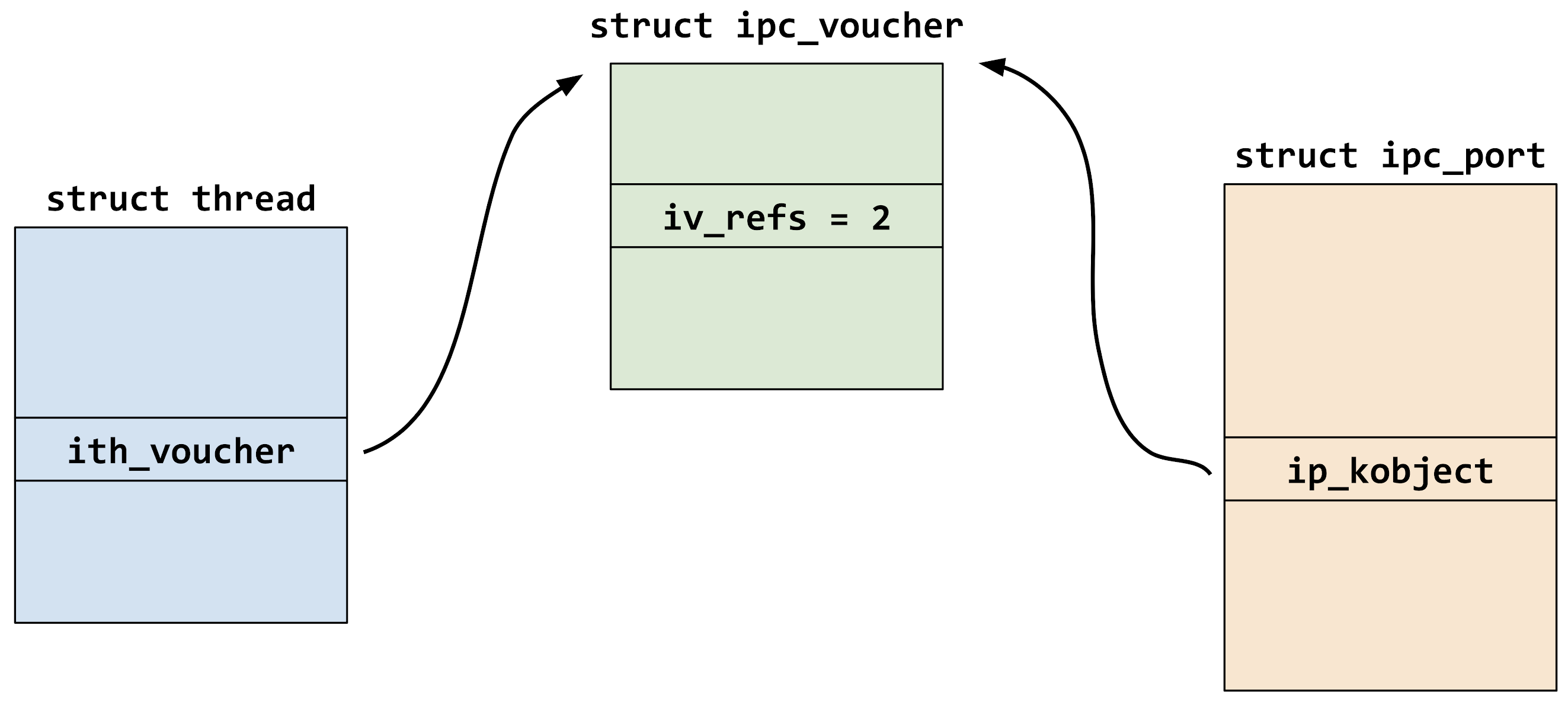 The ipc_voucher structure which is being processed here is in reality now backed by one of the out-of-line memory descriptor backing buffers they sent to the ports_a ports. Since they set all the fields apart from the reference count to 0 the iv_port field will be NULL. That means the kernel will allocate a new port (via ipc_port_alloc_kernel()) then write that ipc_port pointer into the voucher object. OSCompareAndSwap will set the voucher->iv_port field to port: