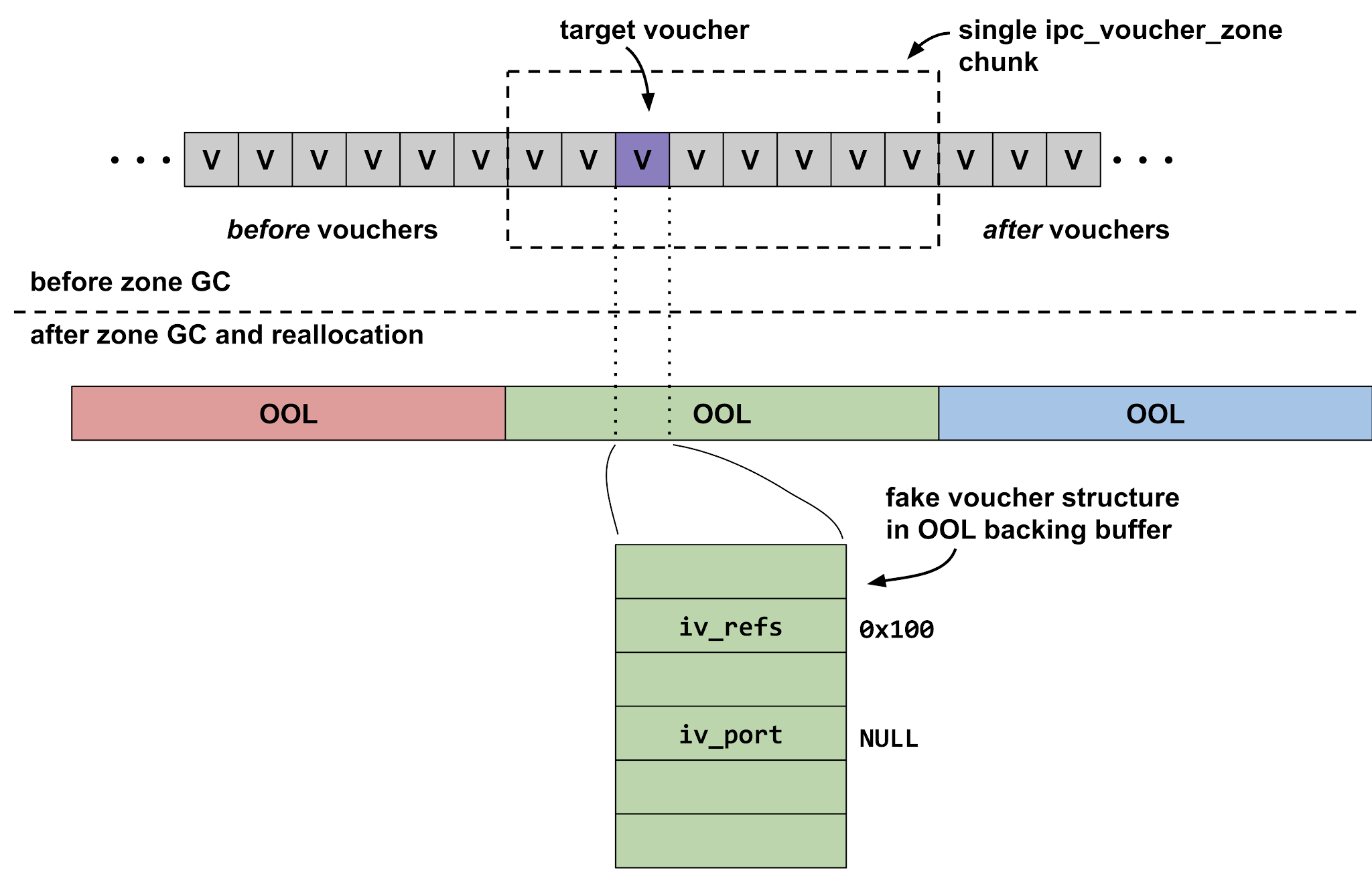 Since an exploit targeting a use-after-free vulnerability in mach vouchers is likely to have to create many vouchers, Brandon's exploit created USER_DATA vouchers, a type that contains user-controlled data such that he could always ensure a new voucher was created: