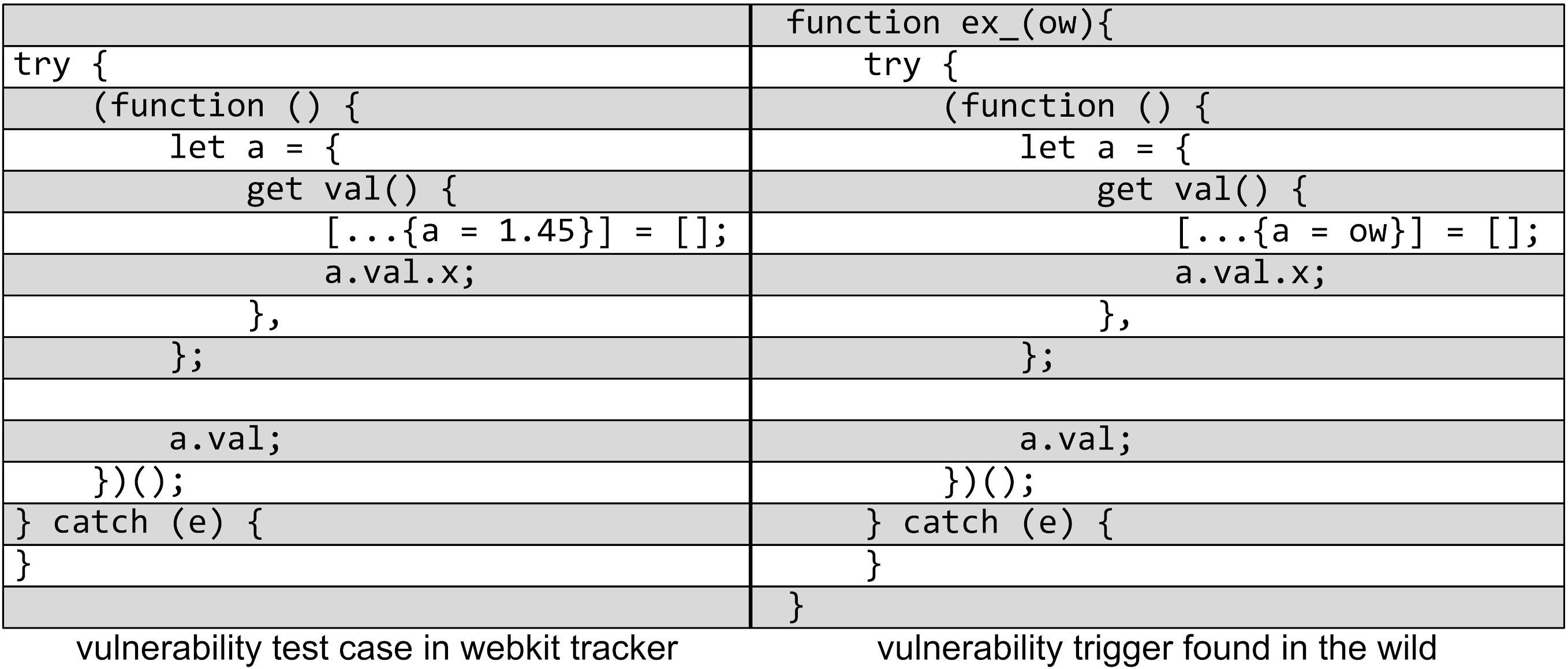 Of interest, the exploit trigger is almost exactly the same as in the bug report and the regression test file in the WebKit repository. This can be seen in the following two images, the left one showing the testcase published in the WebKit code repository as part of the bugfix and the right showing the part of the in-the-wild exploit code that triggered the bug.