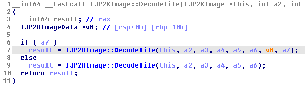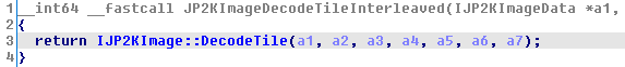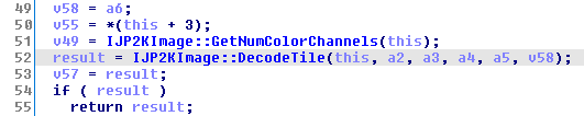 We can clearly rename sub_1004DC58 to IJP2KImage::DecodeTile, or more specifically __ZN10IJP2KImage10DecodeTileEiiiiiP14IJP2KImageData, which is the mangled C++ name of the method. Moving on: