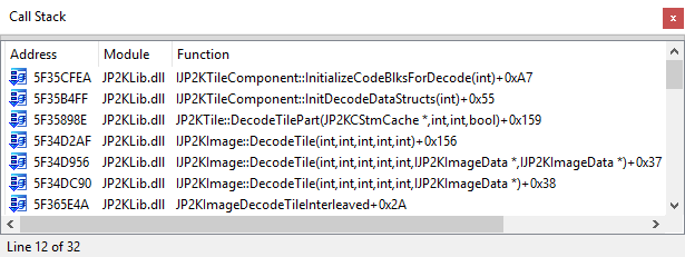 Not very useful, is it? The only correctly recognized symbol is JP2KLib!JP2KImageDecodeTileInterleaved, which is an exported function. Unfortunately, the same crash doesn't reproduce on macOS, so we cannot readily get a symbolized call stack from there, but we can still use the AdobeJP2K Mach-O file to recreate the symbols on Windows. Let's open both JP2KLib.dll and AdobeJP2K in IDA, and start from the JP2KImageDecodeTileInterleaved entry point: