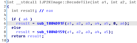 There are two overloaded IJP2KImage::DecodeTile methods, in our case the first one was called when the process crashed. Let's rename sub_1004D91F and look inside it: