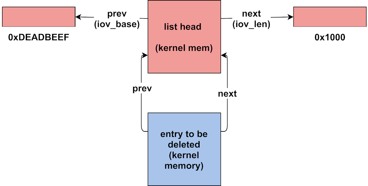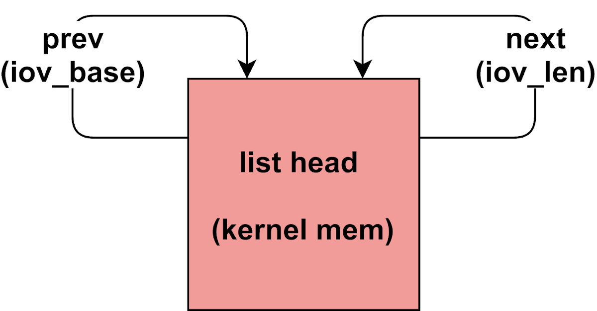 After the list_del the operation looks like the diagram below. The list head prev and next pointers have been set to point to the list head. This means that iov_base has been overwritten with a kernel address and we can now perform scoped read and write operations from the kernel space beginning at the list head.