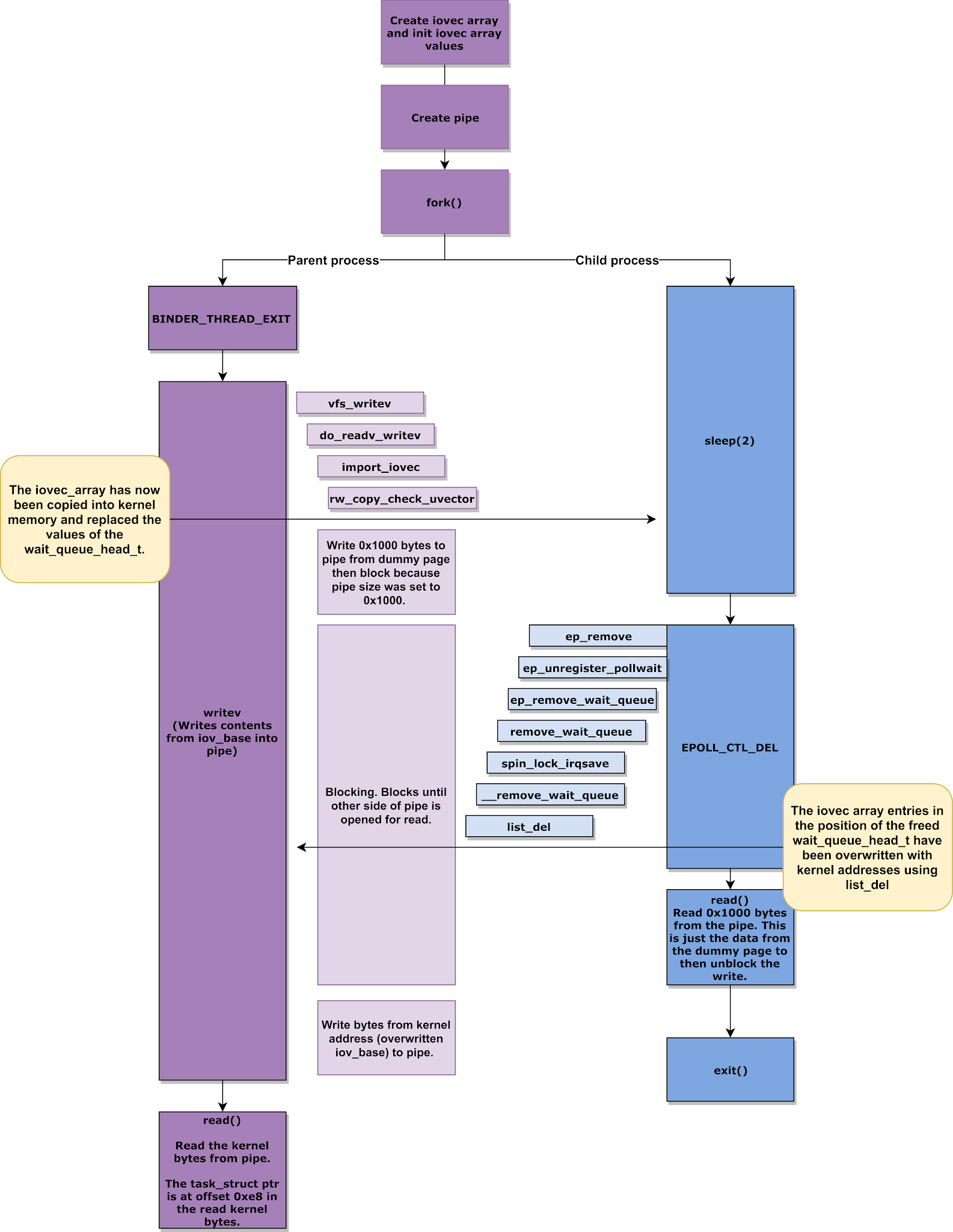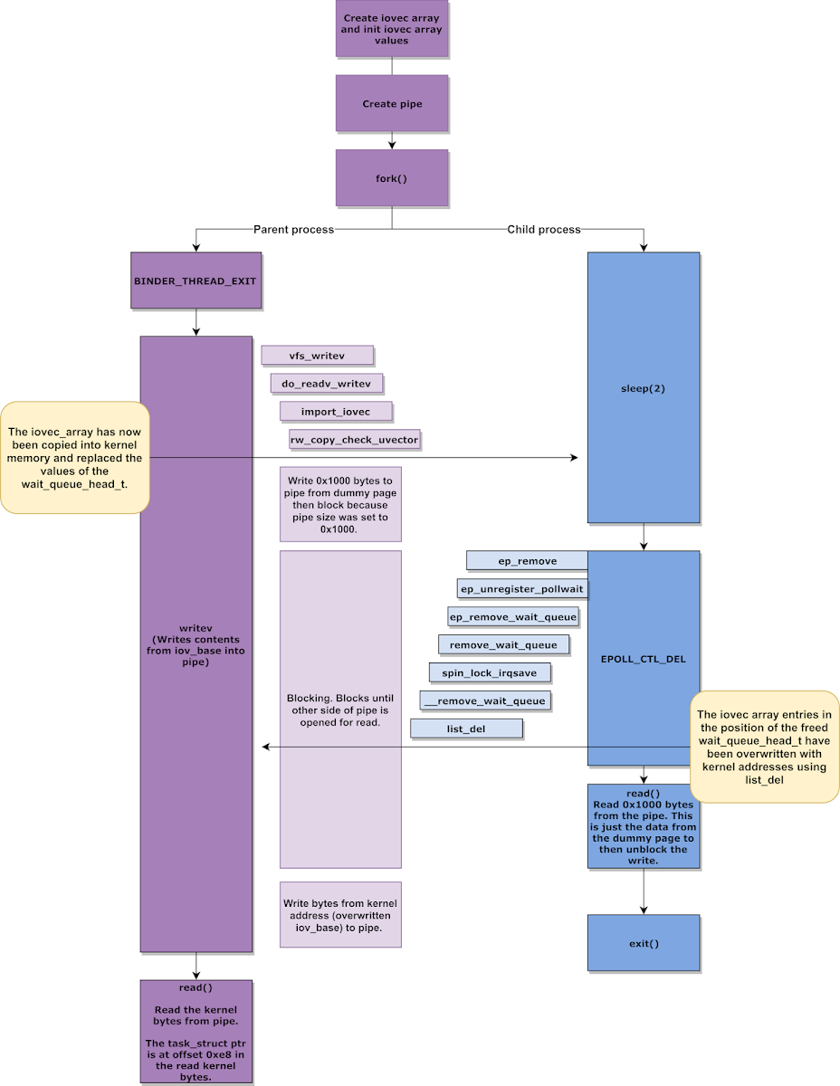 The code to leak the task_struct pointer is in the function leak_task_struct in the PoC. The function starts by adding the binder file descriptor (fd) to the epoll’s interest list. We then create an array of 25 iovec structs. Next, we set the values of each of the iovec entries. For the first 10 entries, we set both the iov_base and iov_len to 0 so that the kernel skips them when processing the vector. iovec[10].iov_base is set to a value that will look like an unlocked spinlock. iovec[10].iov_len is set to the same size as the pipe such that when the pipe will block after moving all the contents from iovec[10].iov_base into the pipe. Once it unblocks, it will begin on iovec[11].