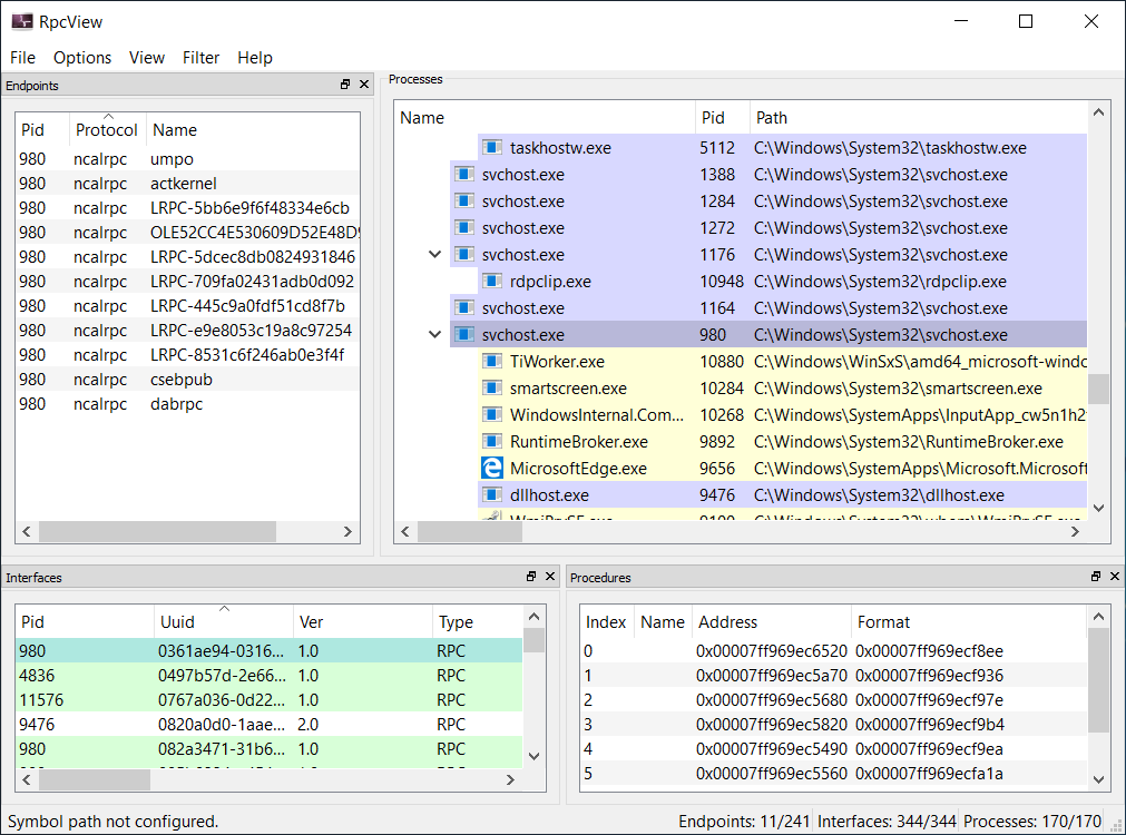 RPC View is an amazing tool to inspect what RPC servers are currently running. It’s all driven through a GUI (as shown above), you can select a process or an RPC endpoint and inspect what functions are available. Once you’ve found an RPC server of interest you can then use the tool’s inbuilt decompiler to generate an IDL file which can be recompiled with the existing Microsoft tooling. This would get me close to the first requirement, extracting RPC server information, although we’d still need to get from an IDL file to a .NET client.