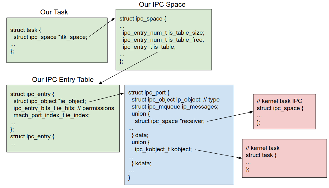 The green nodes above represent all the data structures that are part of our current task which is running the exploit. The blue node is a fake IPC port that we’ll set up to point to the kernel task and the kernel task’s IPC table. Remember the ie_bits field specifies the permissions we have to interact with the ie_object, so we’ll want to make sure we have a send right to it specified there.