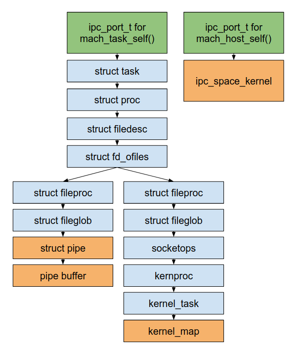 The green nodes above represent the seed values for our exploration, and the orange nodes represent the values we’re trying to find. By spraying a message with an OOL port descriptor array containing pointers to ipc_port structs representing our host port, we find its ipc_port which will give us ipc_space_kernel via the receiver field.