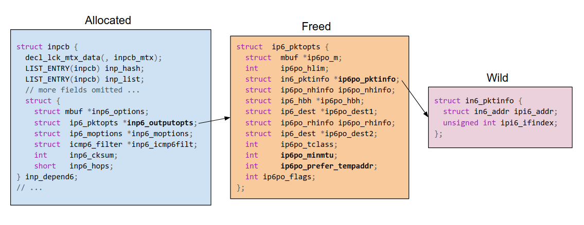 The call to ip6_freepcbopts is the culprit here. In my fuzzer build this function was inlined into ipc6_pcbdetach, which explains the backtrace we saw in the bug report. As you can see, the developers intended for the socket options to be reused in some cases by NULLing out each pointer after it was freed. But because the in6p_outputopts are represented by a pointer to another struct, they are freed by the helper function in6_freepcbopts. That function does not know the address of inp, so it cannot clear &inp->in6p_outputopts, as we can see the code in this snippet neglects to do. This bug does look straightforward upon inspection, but the ROUTE_RELEASE on the following line, for example, is safe because it’s modifying the in6p_route stored inline in the inp and correctly NULLing pointers. Older XNU revisions didn’t NULL anything, and either they were all buggy or this code just wasn’t originally designed to account for reuse of the socket.