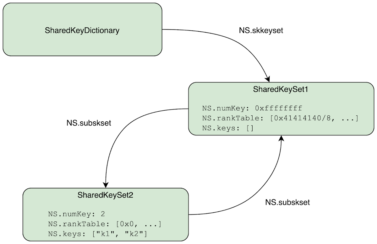- As SharedKeySet2’s rankTable is all zeros, only the first key can be looked up on itself (see lines 8 through 15 in indexForKey:). The second key will then be looked up on SharedKeySet1. Here, as _numKey and _rankTable’s content are fully controlled, the code will, in line 10, index into _keys (which is nullptr) with a controlled index, causing a crash.