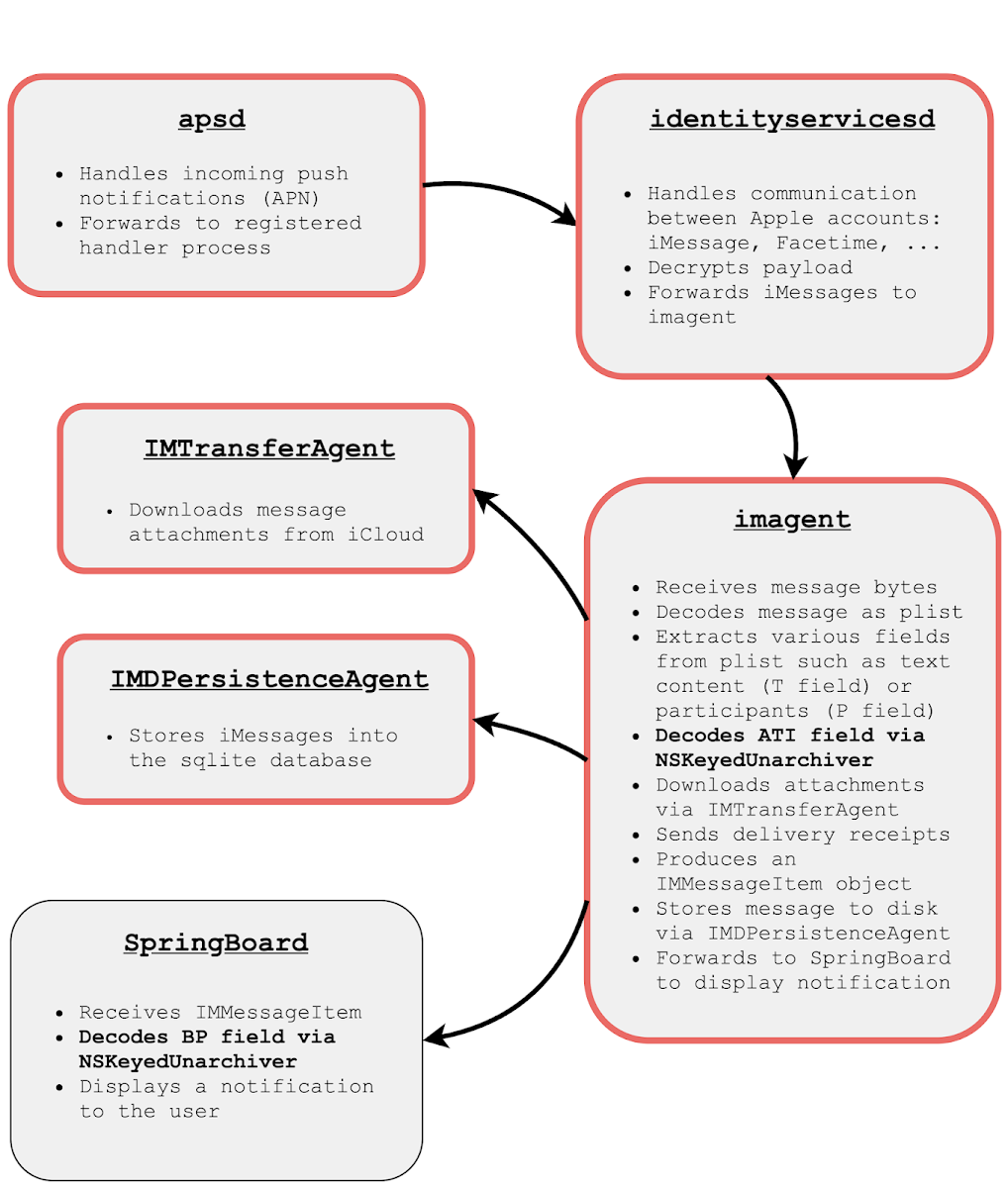 Incoming iMessages pass through multiple services and frameworks before a notification is finally displayed to the user and the message is written to the messages database. The main services handling iMessages on iOS 12.4 without requiring user interaction are depicted below. A red border indicates the existence of a sandbox for the process.