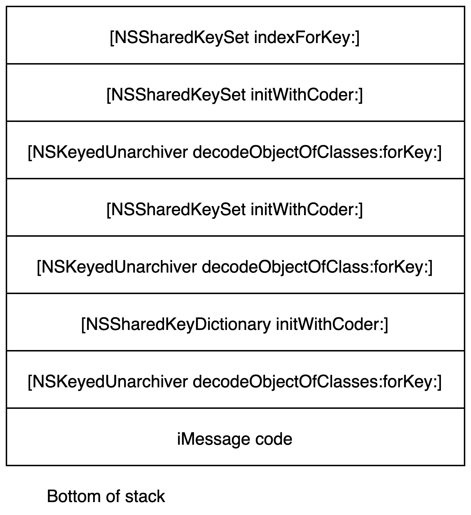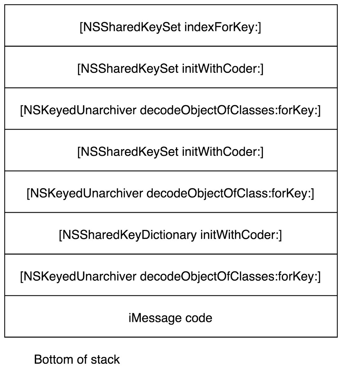 The bug in question occurs during unarchiving of an NSSharedKeyDictionary, a special kind of NSDictionary in which the keys are declared up front in an NSSharedKeySet to allow for faster element access. Further, an NSSharedKeySet can itself have a subSharedKeySet, essentially building a linked list of KeySets.