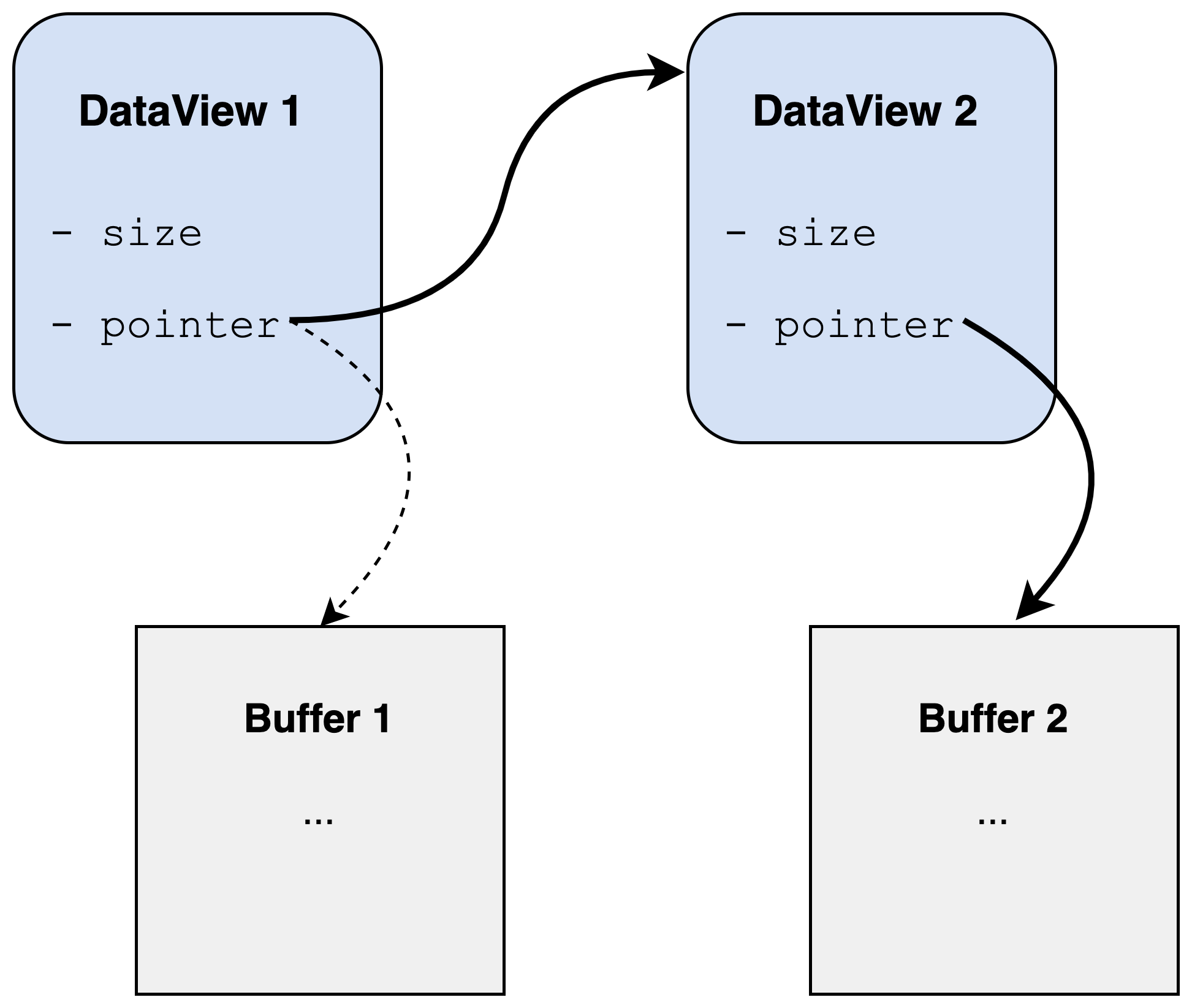 Gaining memory read/write in JavaScript is rather easy with a standard browser exploitation technique: corrupting JavaScript DataViews/TypedArrays. In particular, two DataView objects can be created in JS, then returned to ObjC, where the first one is corrupted so that its backing memory pointer now points to the second one. The resulting situation is shown in the image below. Corrupting the backing storage pointer is possible by using the memory read/write primitive in SLOP as described above.