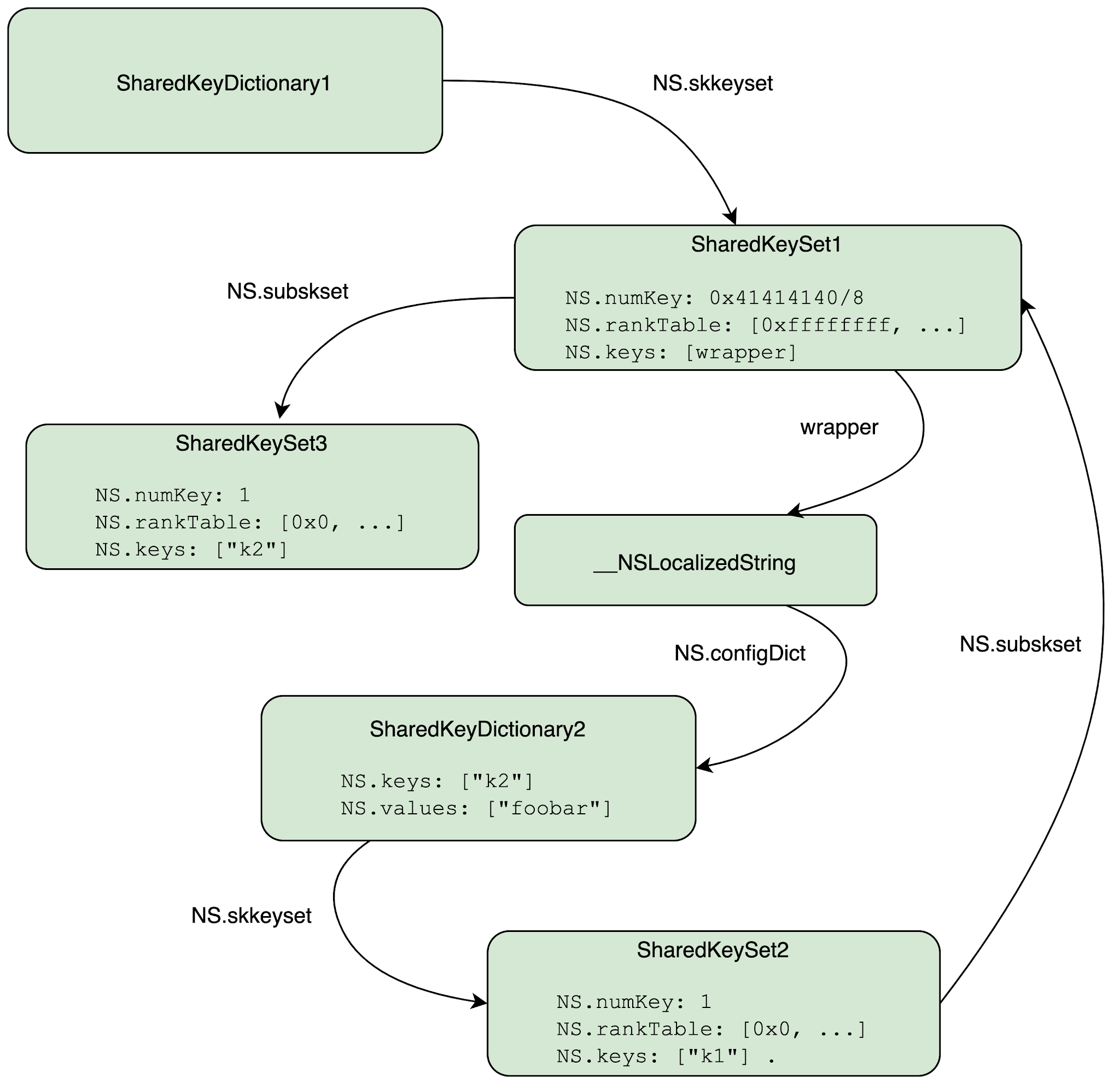 When the shown object graph is unarchived, SharedKeyDictionary2 will attempt to store the value for “k2” in itself and will thus call [SharedKeySet2 indexForKey:"k2"]. This in turn will recurse to SharedKeySet1, which will also not find the key (as the index fetched from its _rankTable is larger than _numKey) and recurse further. Finally, SharedKeySet3 will be able to lookup “k2” and return the currently accumulated offset, which is (1 + 0x41414140/8). SharedKeyDictionary2 will then access 0x41414148, call objc_release on the value read there and finally write the NSString “foobar” to that address. This now provides the arbitrary objc_release primitive required for further exploitation.