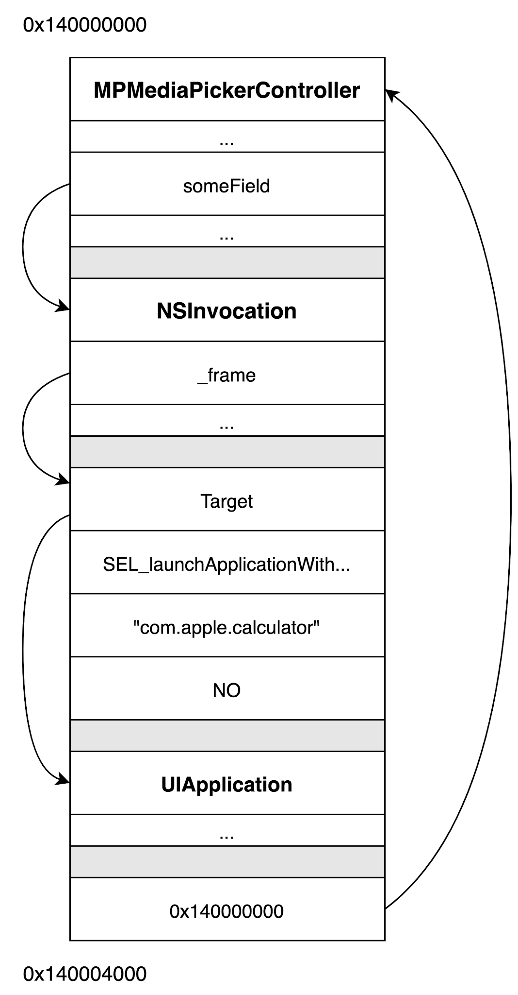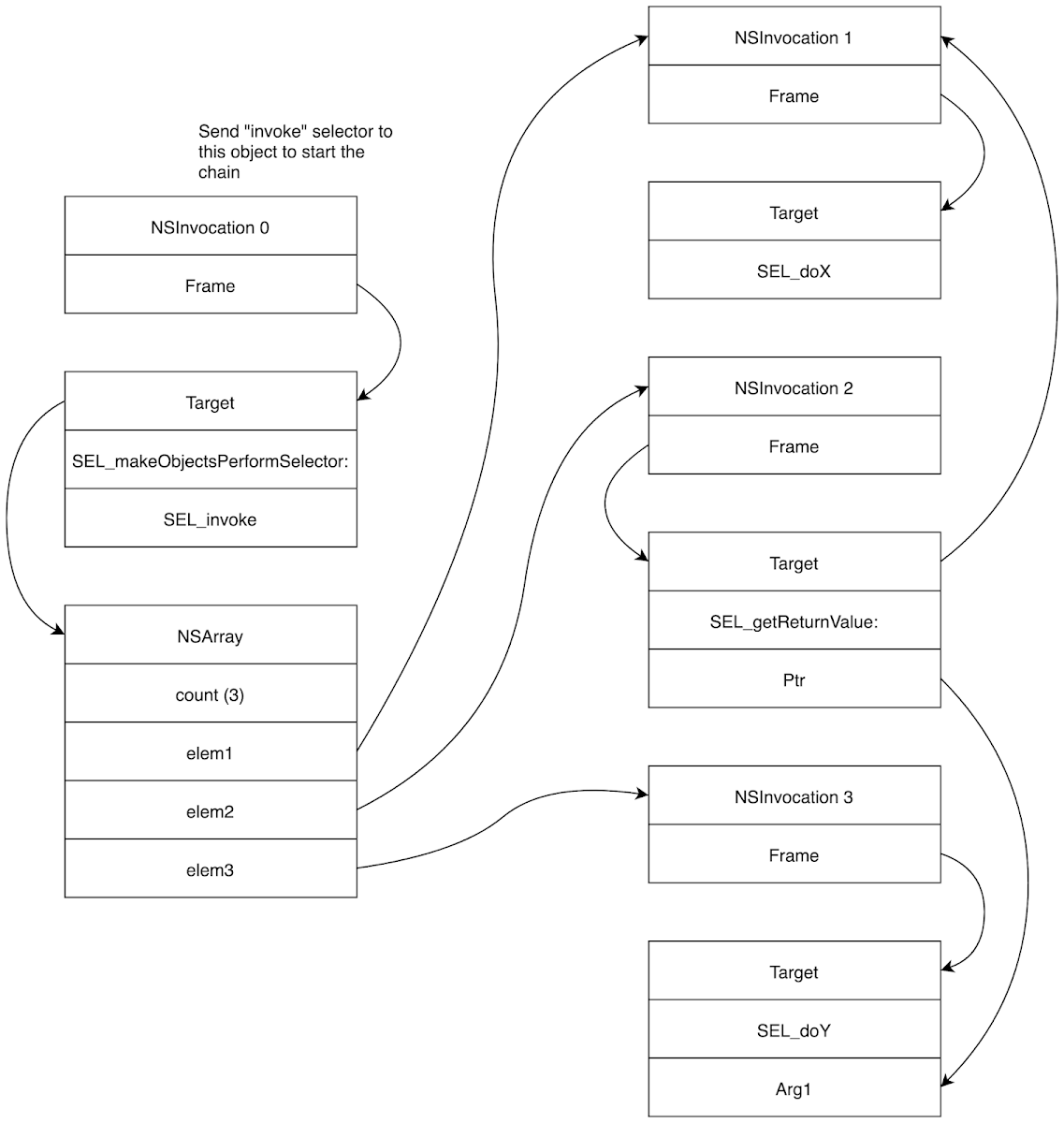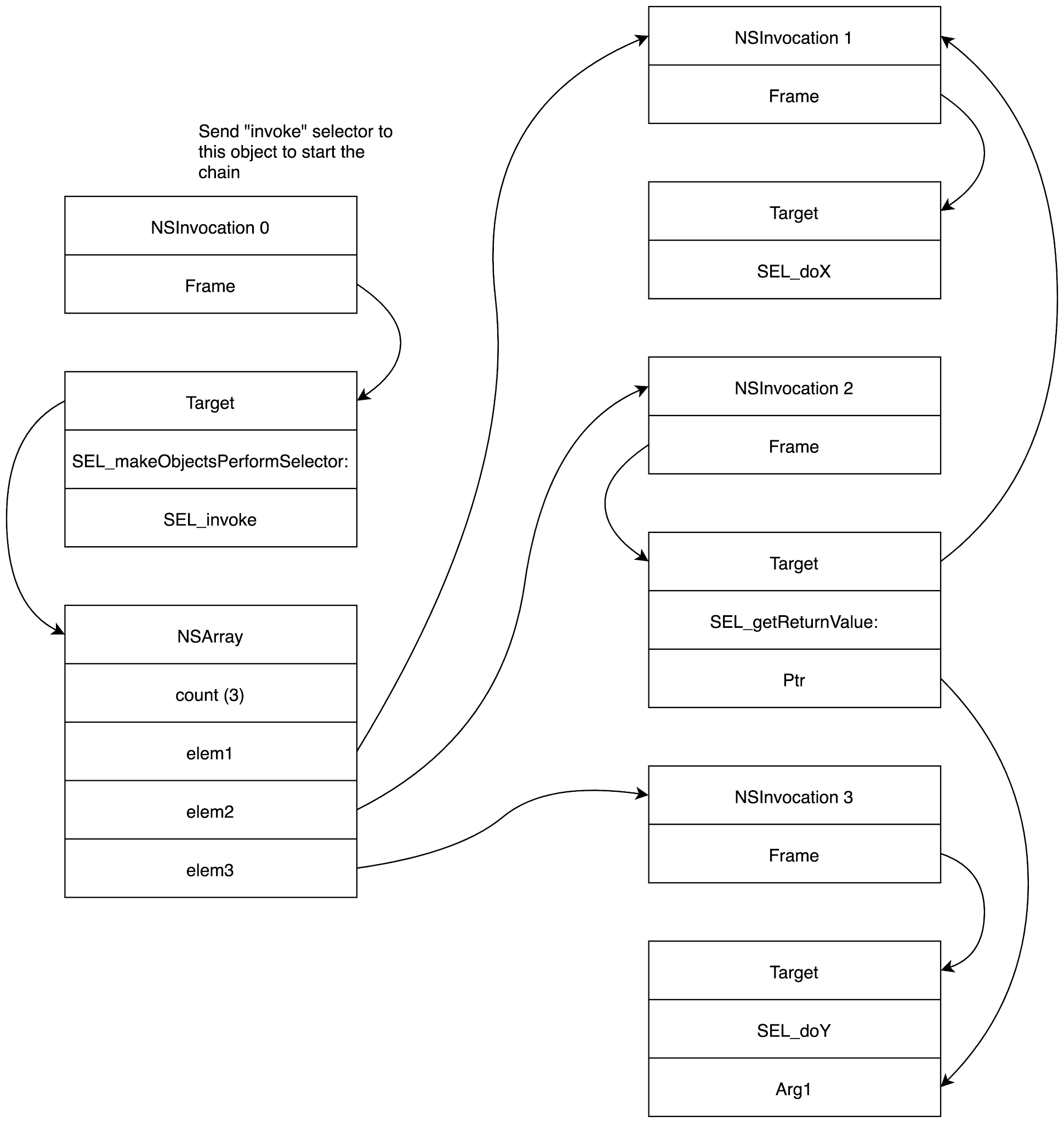 First, it is possible to chain multiple selector calls together by creating a fake NSArray containing fake NSInvocation objects, then calling [NSArray makeObjectsPerformSelector:@selector(invoke)] on it (through the “bootstrap” NSInvocation that is invoked during [MPMediaPickerController dealloc]). This will invoke each of the NSInvocations, thus performing multiple independent ObjC method calls.