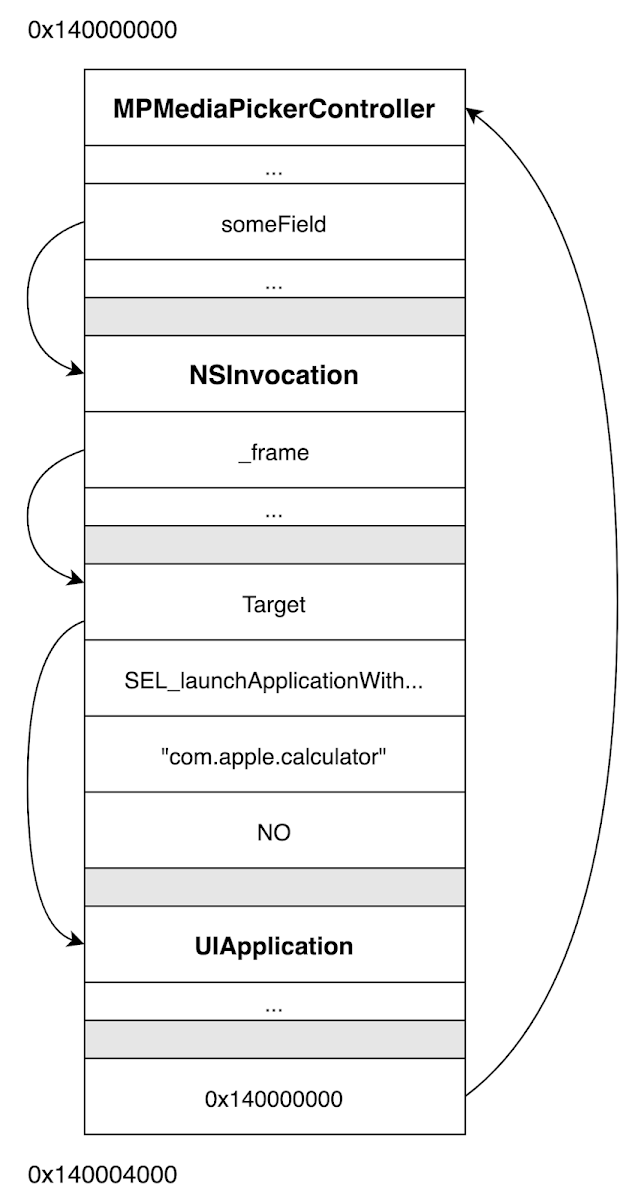 The final heap spray layout then looks roughly as depicted below. The heap spray must now be a bit bigger because the previously used address 0x110000000, which will now also be used as the size argument to calloc, will not cause calloc to fail on newer devices, so a higher address such as 0x140000000 is necessary. Note also that the call to ‘setMediaPickerController’ in the dealloc implementation can simply be survived by setting someOtherField to zero, in which case objc_msgSend generally becomes a nop. NSInvocation objects are made up of a “frame”, a pointer to a buffer containing the arguments for the call, as well as storage for the return value and a reference to a NSMethodSignature object containing information about the number and type of the arguments. The latter two fields are omitted in the diagram for brieviety.