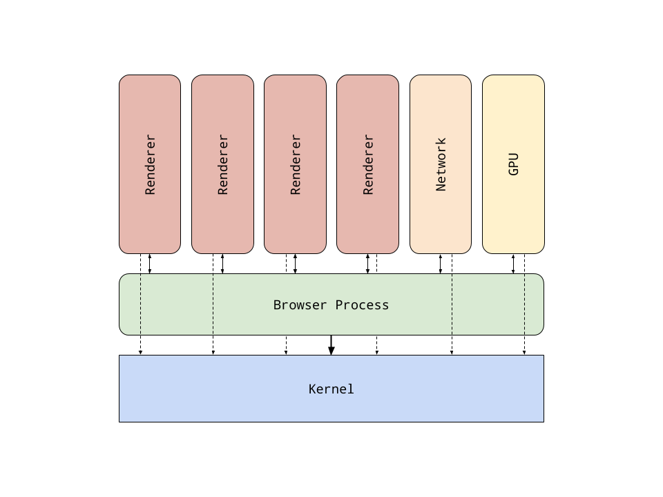 The renderer processes are in separate sandboxes and the access to the kernel is limited, e.g. via a seccomp filter on Linux or win32k lockdown on Windows. But for the renderer to do anything useful, it needs to talk to other processes to perform various actions. For example, to load an image it will need to ask the network service to fetch it on its behalf.