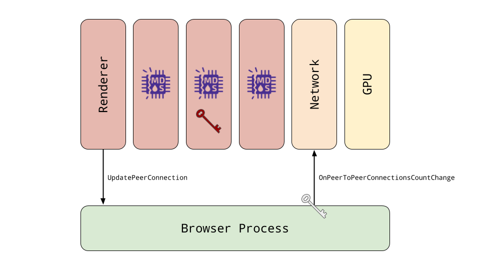 To find out how to trigger messages from the browser process to the NetworkService, I looked at the IPC methods in the interface to find one that looks like I might be able to influence it from a renderer. NetworkService.OnPeerToPeerConnectionsCountChange caught my eye and in fact, this method gets called every time when a WebRTC connection gets updated. You just have to create a fake WebRTC connection and everytime you mark it as connected/disconnected it will trigger a new message to the NetworkService.