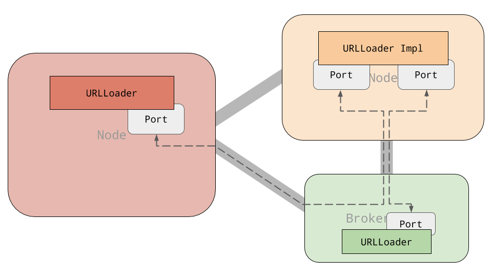Under the hood, Mojo uses a platform specific message pipe between processes, or more specifically between nodes in Mojo. Two nodes can be connected directly with each other but they don’t have to since Mojo supports message routing. One node in the network is called the broker node which has some additional responsibilities to set up node channels and perform some actions restricted by the sandbox.