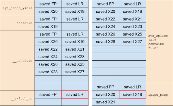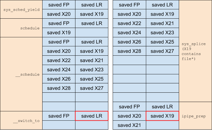 Similarly, we can leak the address of the struct file associated with a pipe using sched_yield() and pipe-to-pipe splice(). The stack layouts for this look as follows (entry-from-EL0 exception frames not shown, since they look the same for all syscalls):