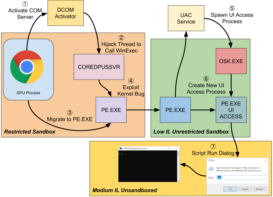 We can now exploit the kernel bug and call CreateProcessAsUser from the new process with the unrestricted token running at Low IL. This removes all sandboxing except for Low IL. The final step is breaking out of Low IL.Again there’s probably plenty of ways of doing this but I decided to abuse the UAC service. I could have abused the Debug Object bug documented in my previous blog, however I decided to abuse a different “feature” of UAC. By abusing the same Token access we’re abusing in the chain to open the unrestricted token we can get UI Access permissions. This allows us to automate privileged UI (such as the Explorer Run Dialog) to execute arbitrary code outside of the Low IL sandbox. It’s not necessarily efficient but it’s more photogenic. Full documentation for this attack is available in another blog post.