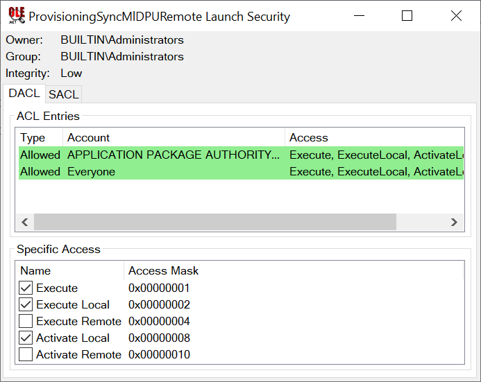 On a default installation of Windows 10 we have 6 candidates. Note that the last 4 are all in DLLs, however these classes are registered to run inside a DLL Surrogate so can still be used out-of-process. I decided to go for the servers in COREDPUSSVR because it’s a unique executable rather than the generic DLLHOST so makes it easier to find. The Launch Security for this COM server grants Everyone and all AppContainer packages local activation permission as shown below: