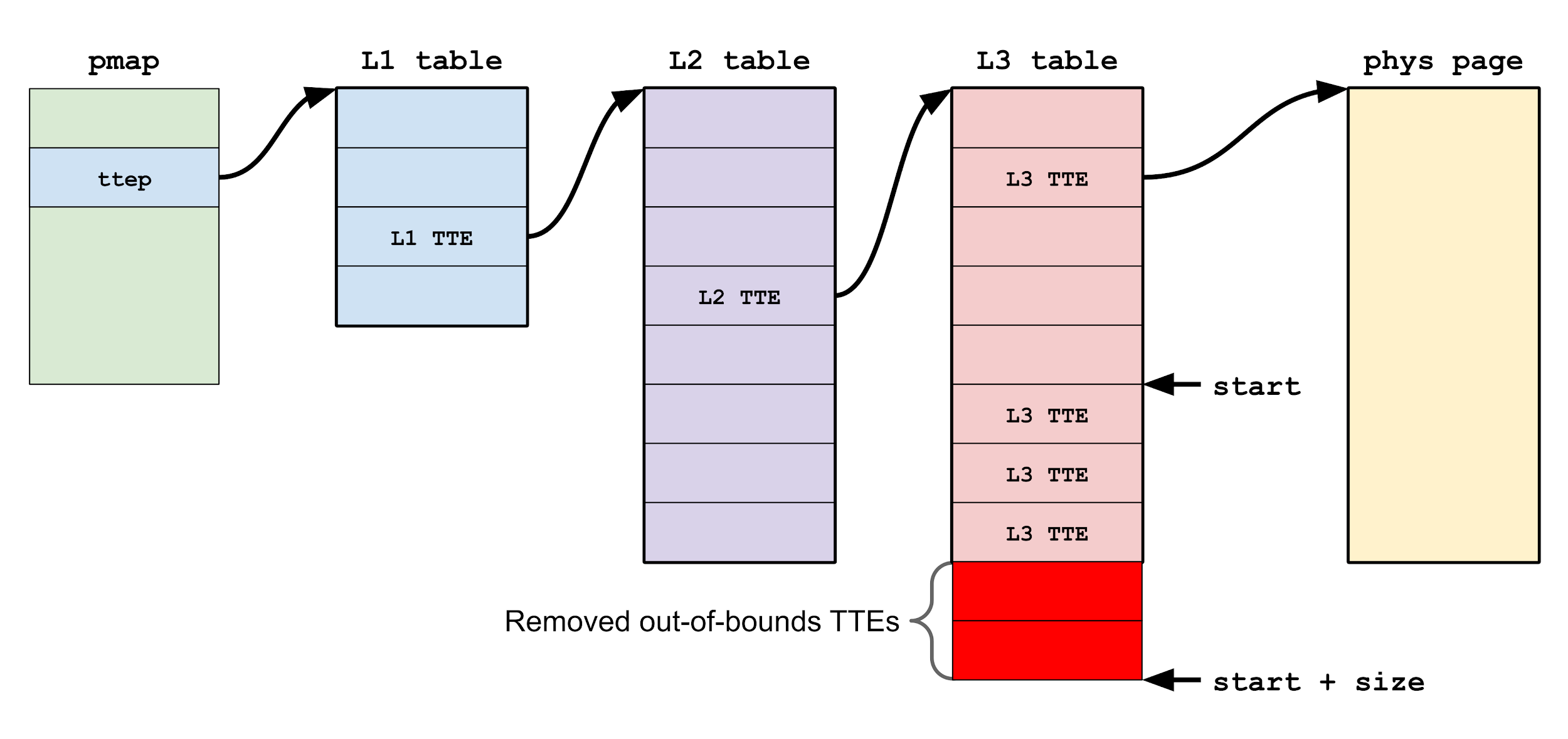 The actual work of removing the translation table entries (TTEs) that map the supplied virtual address range is done by calling pmap_remove_range_options(), which takes pointers to the beginning and end of the TTE range to remove from the level 3 (leaf) translation table.