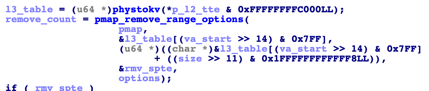 This means that if we have an arbitrary kernel function calling primitive, we can invoke the PPL-entering wrapper function directly and get pmap_remove_options_internal() called with an improper virtual address range, which makes pmap_remove_range_options() try to remove "TTEs" read from out-of-bounds memory while in PPL mode. And since the removed TTEs are zeroed out, this means that we can corrupt PPL-protected memory.