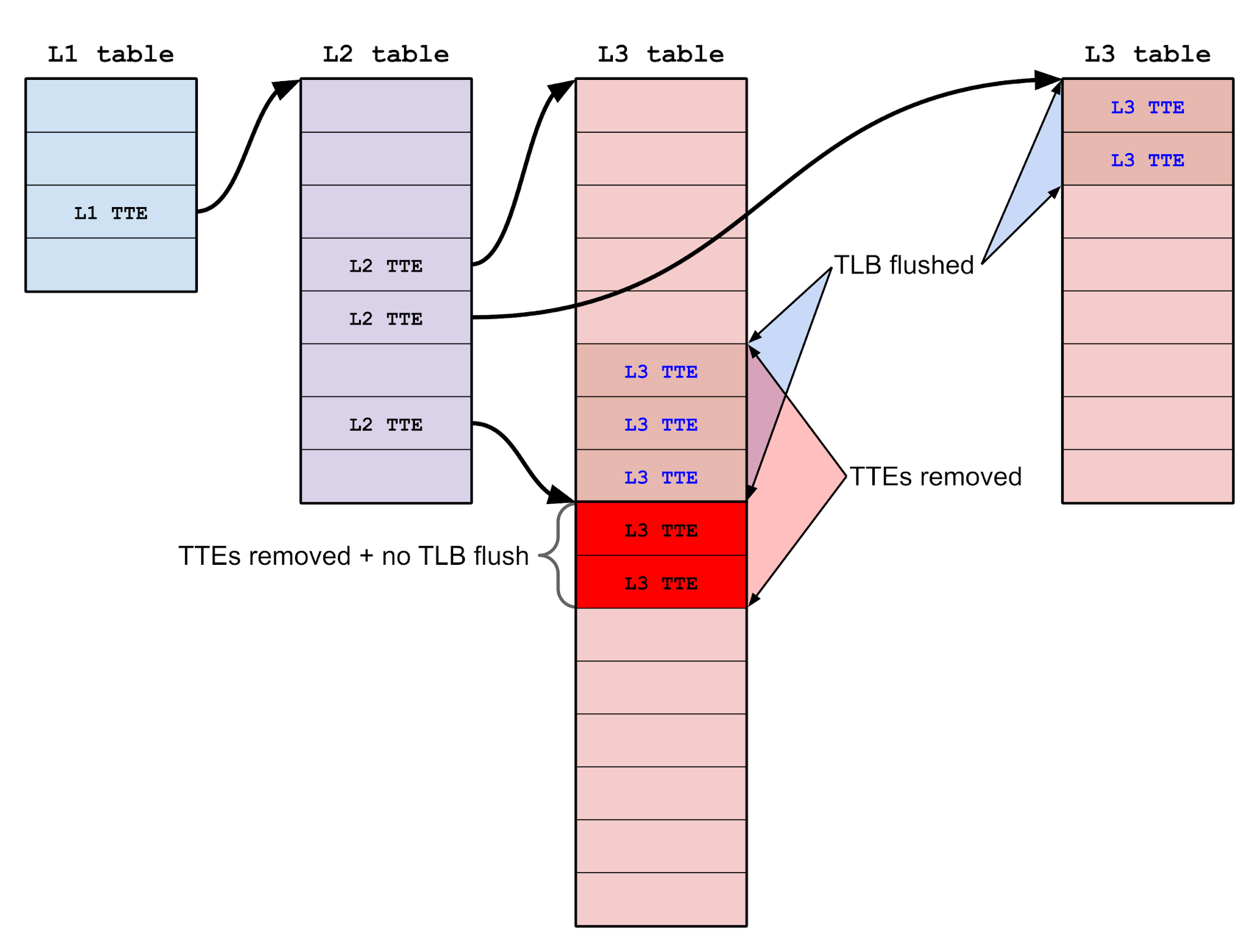 - Fault in a page for virtual address R so that page Q is allocated as an L3 TT for R, even while we continue to have a stale TLB entry for Q.