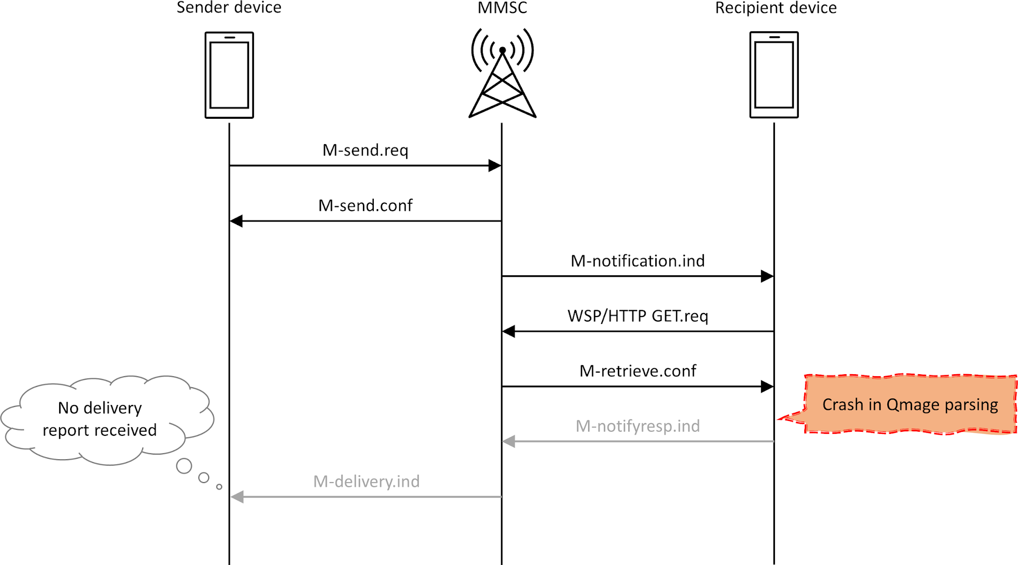 The biggest problem shown in the diagram is the fact that the Samsung Messages app parses the incoming MMS before finalizing communication with the MMSC through the M-notifyresp.ind PDU. Ideally, any processing of external data should only take place once the connection with MMSC is closed. Otherwise, if the app crashes during the processing of a corrupted media file, the final M-notifyresp.ind message is never transmitted, which causes the MMSC to classify the MMS delivery as unsuccessful and prevents it from sending the delivery receipt to the originator. This creates a very easily observable side channel, revealing whether Samsung Messages crashed on the victim phone or not.