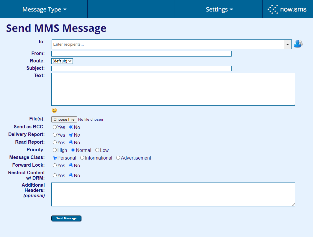 To that end, I purchased two SIM cards for sending and receiving messages, and enabled an "unlimited MMS" package on the sender one to avoid excessive costs. Then, I found and licensed the NowSMS Windows software, which is a powerful solution for sending, receiving, and processing SMS/MMS. It may serve as an SMS server, MMS server, WAP Push Proxy Gateway and Multimedia Messaging Center (MMSC), and has a number of advanced features that are beyond the scope of our use case. Most importantly, it can be used to send messages through a locally connected GSM modem, or an Android phone acting as one. This is precisely the functionality we need, and it's available even in the most basic Now SMS & MMS Lite package. Notably, the service can be used in a number of ways: via a local web interface, through an HTTP API, and through developer API made available for technologies such as PHP, Java and .NET (C#, Visual Basic). The vendor also maintains an extensive documentation regarding both the product and relevant mobile protocols, and hosts an active user forum. All in all, NowSMS proved extremely helpful in my research by making interactions with SMS/MMS easily accessible on a PC, both manually and programmatically.
