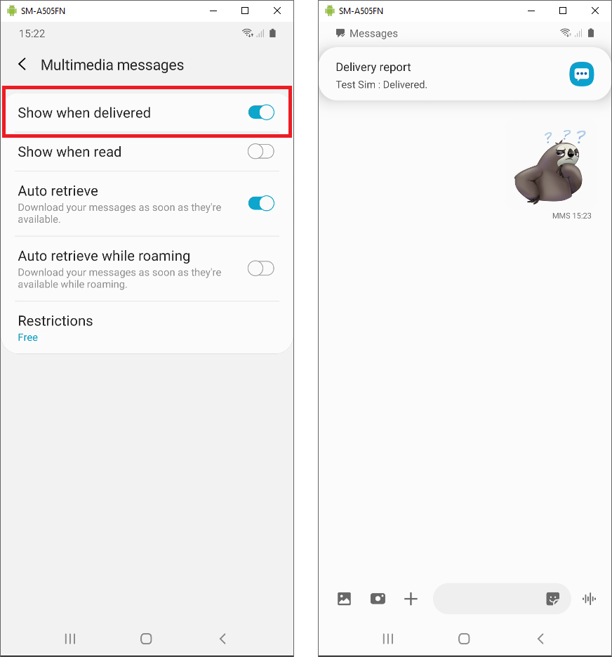 Quite frankly, I have never legitimately used this feature of MMS before. Even though it's part of the protocol, the option to request delivery reports is missing in some common apps such as Google Messages (it only supports SMS delivery reports). However, Samsung Messages does support it, so we can enable the reports under Settings > More settings > Multimedia messages > Show when delivered, and test it out: