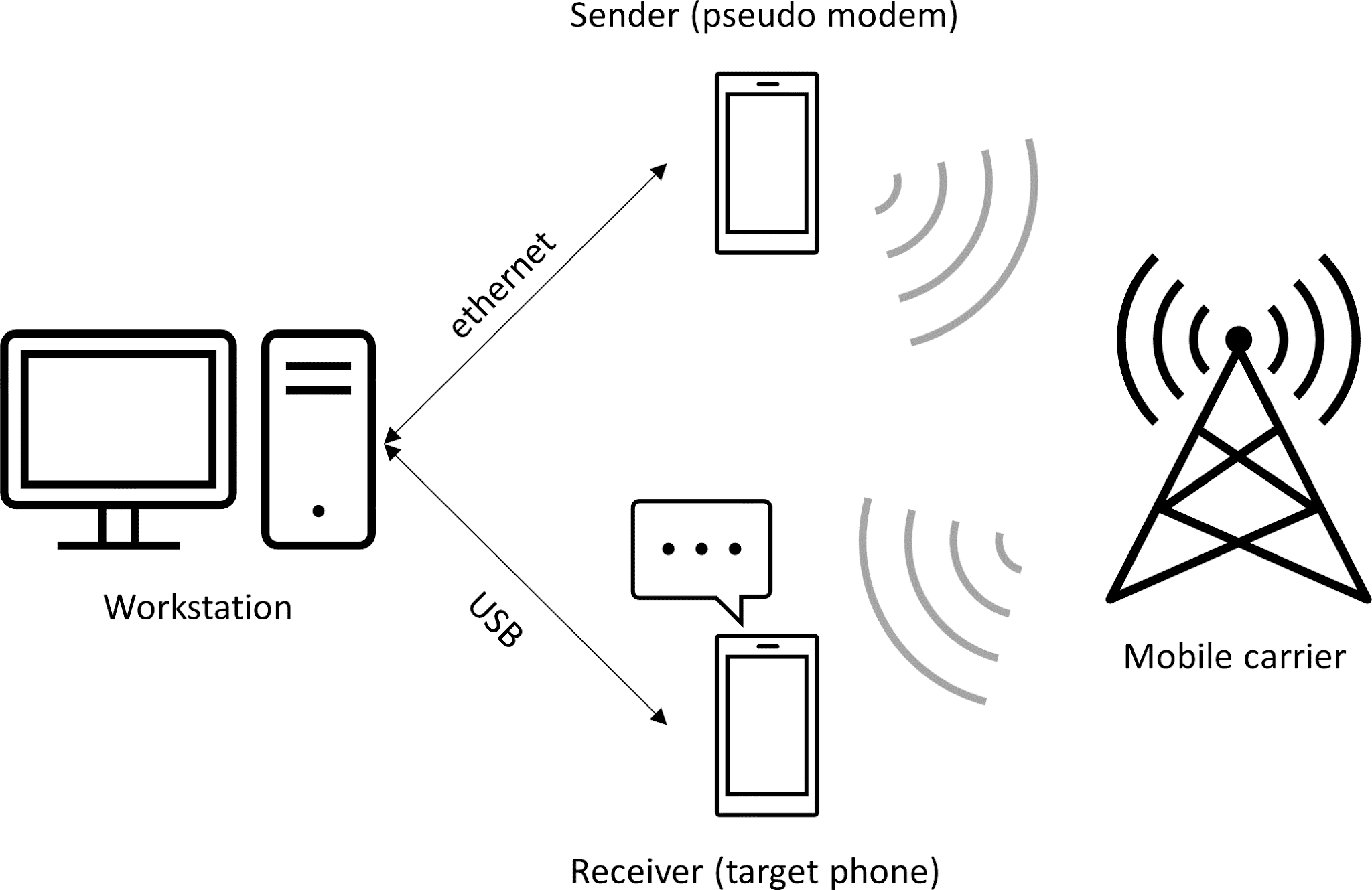 The Android phone acting as a modem may operate in three modes: "Local WiFi", "Remote Direct" and "Remote via Cloud". In my case, I used the Remote Direct mode, and connected the sender phone to the local network via an ethernet cable, to prevent any disruptions related to wireless connectivity. At the same time, I connected the victim phone to my workstation via a USB cable for command line access and screen capturing. The structure of my setup is illustrated below: