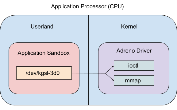 Specifically for Qualcomm Adreno, the /dev/kgsl-3d0 device file is ultimately used to implement higher level GPU functionality. The /dev/kgsl-3d0 file is directly accessible within the untrusted application sandbox, because: