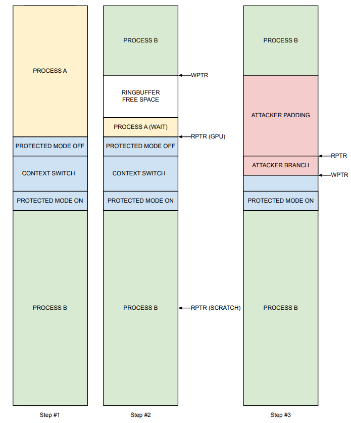 The typical pattern for protected mode operations is to 1) drop protected mode, 2) perform some privileged operations, and 3) re-enable protected mode. Therefore, to recover the attack, we can perform a race condition between steps 1 and 3. We can start the execution of a privileged operation such as a GPU context switch, and while it is still executing on the GPU with protected mode disabled, we can overwrite the privileged operations using the RPTR ringbuffer corruption primitive, essentially replacing the GPU context switch with an attacker-controlled indirect branch.