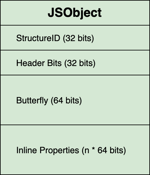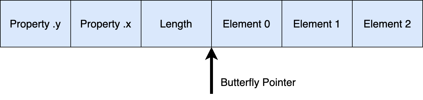 In order to fake objects, one has to know their in-memory layout. A plain JSObject in JSC consists of a JSCell header followed by the “Butterfly” and possibly inline properties. The Butterfly is a storage buffer containing the object’s properties and elements as well as the number of elements (the length):