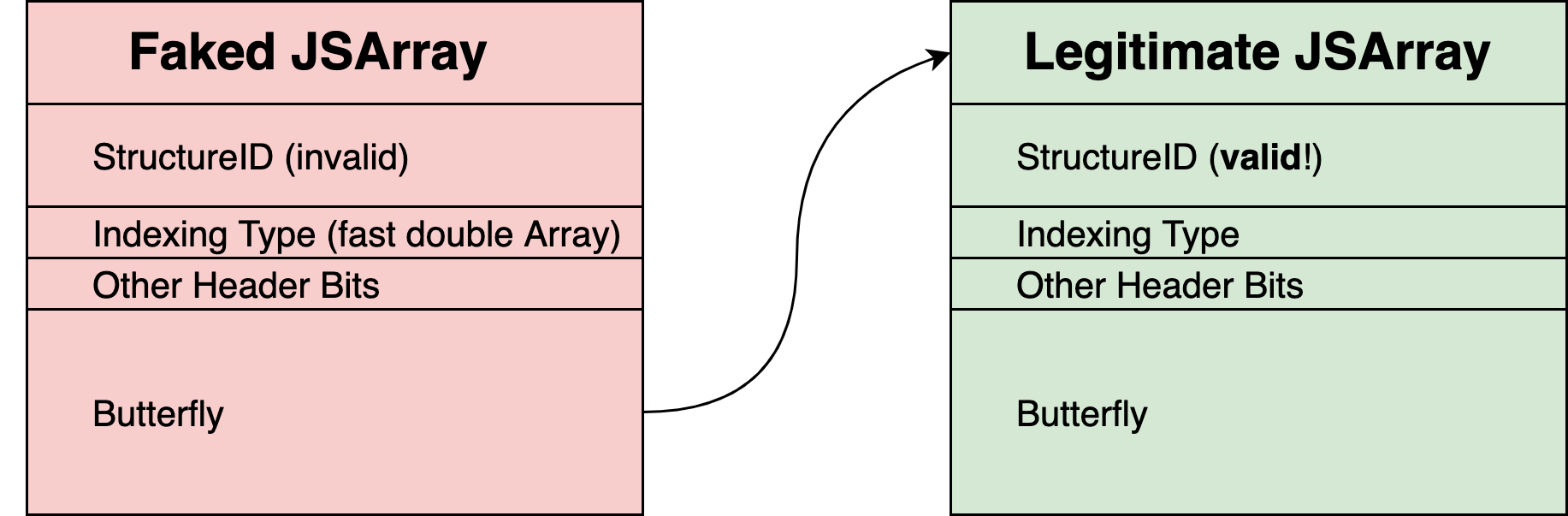 However, while ArrayBuffer storages are caged, JSArray Butterflies, which contain the array’s elements, are not. As they can store raw floating point values, an attacker immediately gains a fairly powerful arbitrary read/write by faking such an “unboxed double” JSArray. This is how various public exploits have worked around the Gigacage in the past. (Un)fortunately, WebKit has introduced a mitigation aimed to stop an attacker from faking JavaScript objects entirely: StructureID randomization. This mitigation will thus have to be bypassed first.