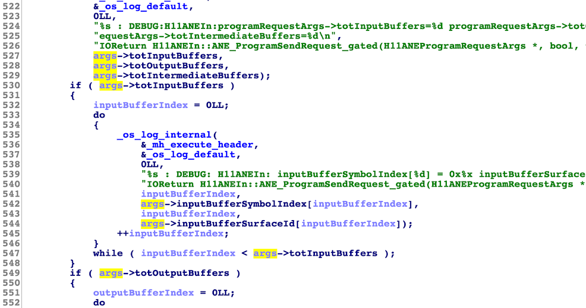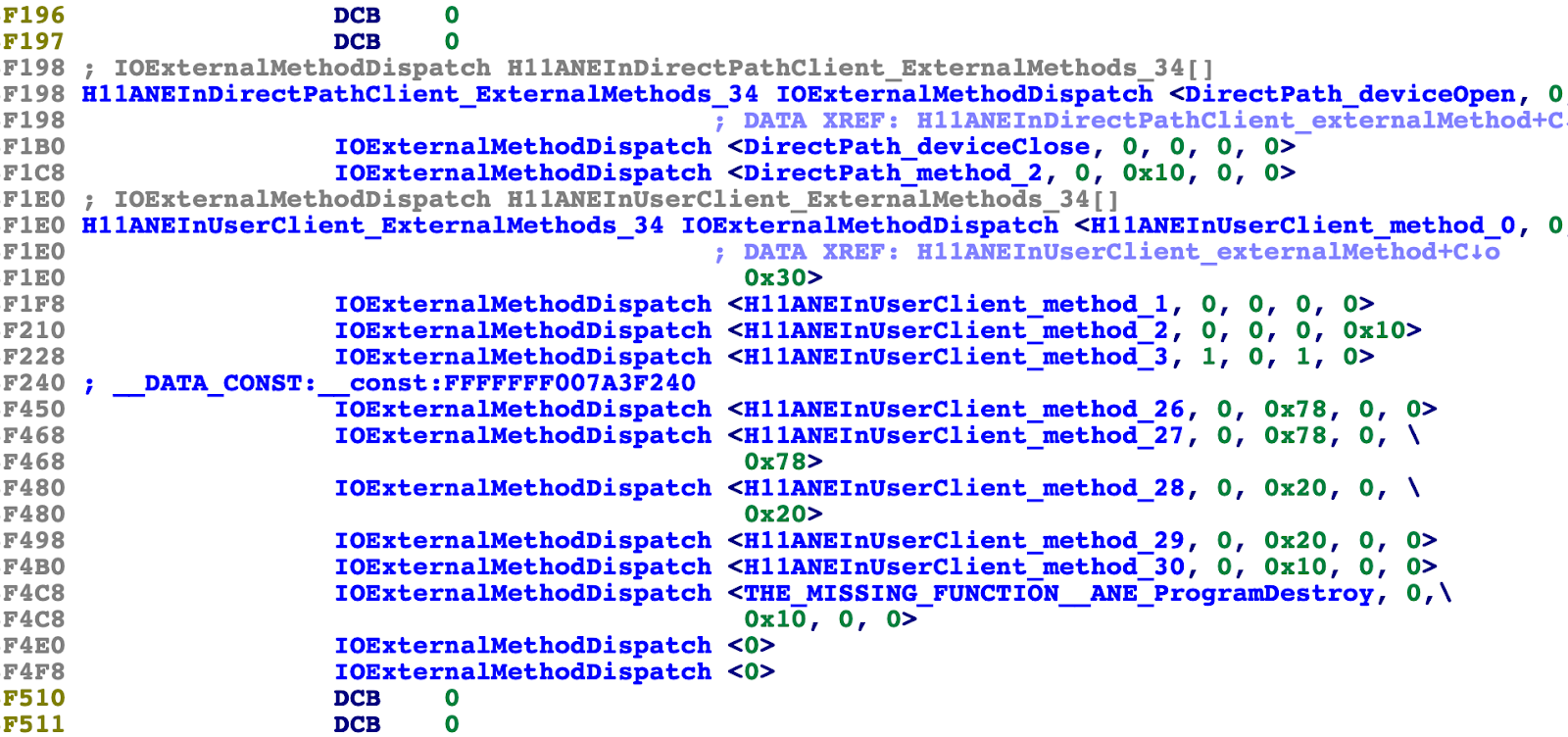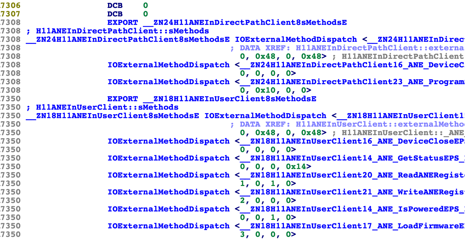 Oddly, the external method tables for both H11ANEInDirectPathClient and H11ANEInUserClient had defined symbols. This was weird: I had expected the code would consist of a single array of IOExternalMethodDispatch structs, so that H11ANEInDirectPathClient could claim the 34 methods starting at index 0 while H11ANEInUserClient could claim the 34 methods starting at index 3. In such an arrangement, there should only be one symbol, that for the array as a whole.