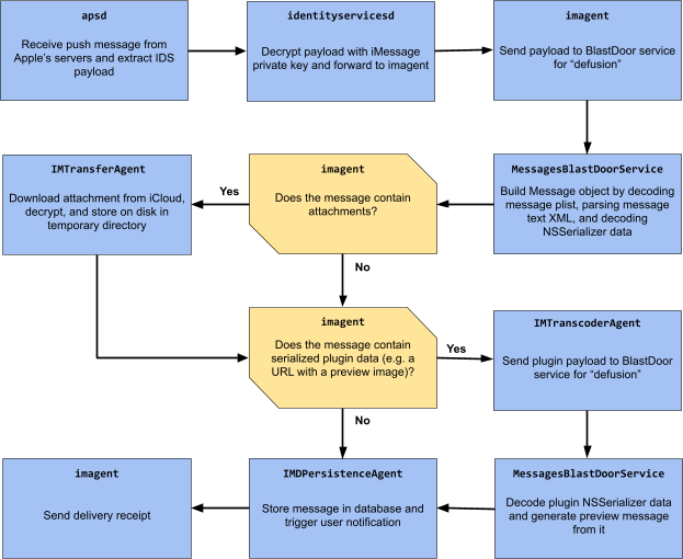 As can be seen, the majority of the processing of complex, untrusted data has been moved into the new BlastDoor service. Furthermore, this design with its 7+ involved services allows fine-grained sandboxing rules to be applied, for example, only the IMTransferAgent and apsd processes are required to perform network operations. As such, all services in this pipeline are now properly sandboxed (with the BlastDoor service arguably being sandboxed the strongest).