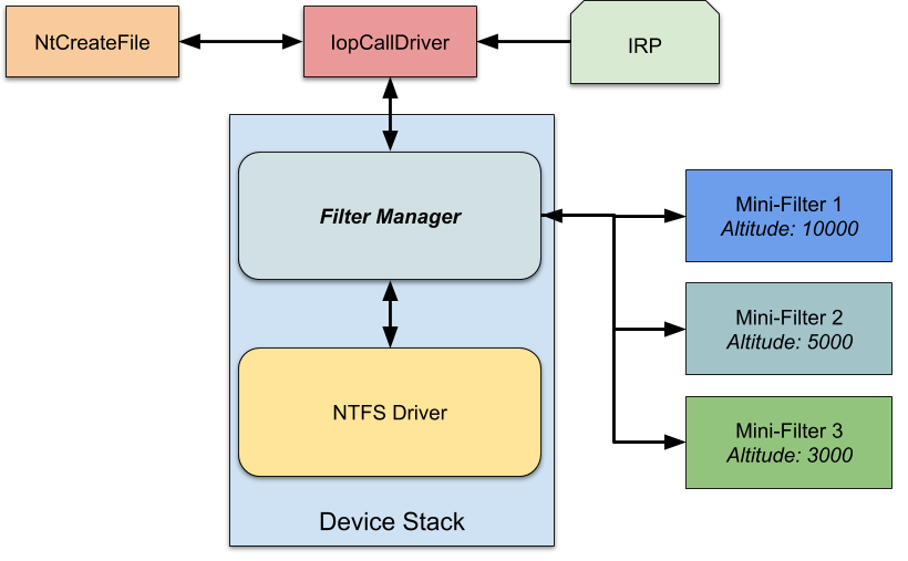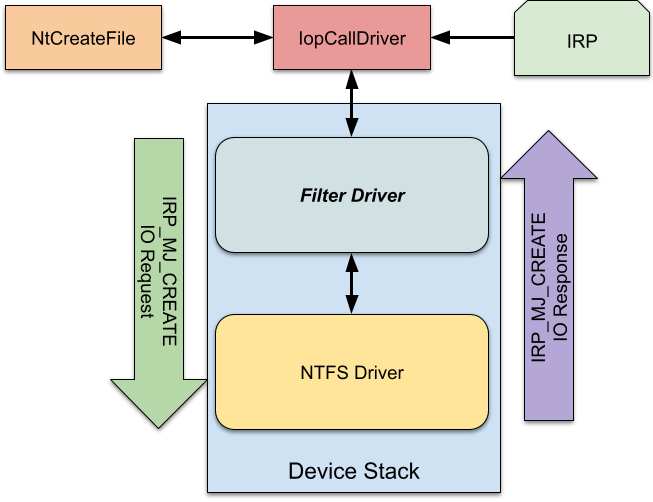 A filter driver exploits the way the Windows IO Manager implements file system drivers. When you make a request to access a file, such as calling the NtCreateFile system call the IO Manager allocates an IO Request Packet (IRP) structure which contains the operation type and all the parameters for the operation. The IRP is then dispatched to the top of the device stack associated with the request.