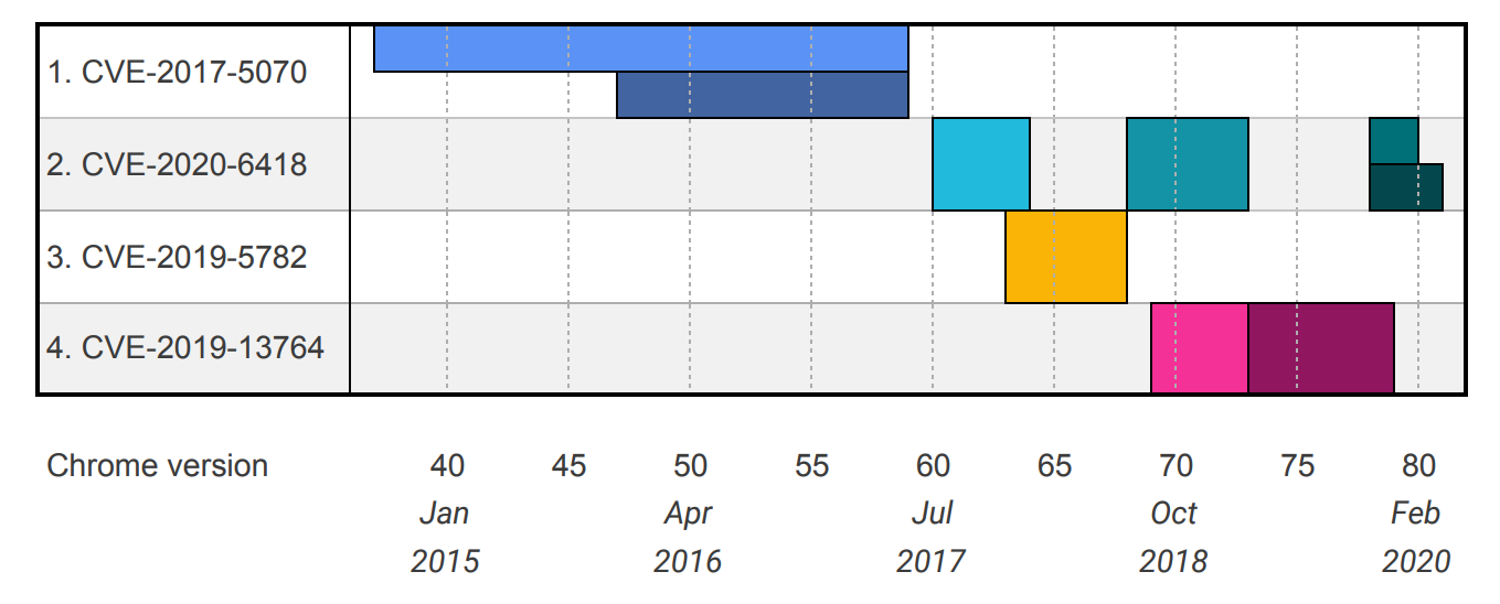 As we continue the series on the watering hole attack discovered in early 2020, in this post we’ll look at the rest of the exploits used by the actor against Chrome. A timeline chart depicting the extracted exploits and affected browser versions is provided below. Different color shades represent different exploit versions.