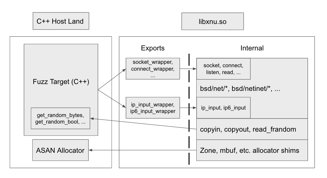 Before we dive in, let’s define the overall structure of the project as pictured below. There’s going to be a fuzz target implemented in C++ that translates fuzzed inputs into interactions with the userland XNU library. The target code, libxnu, exposes a few wrapper symbols for syscalls and ip_input as mentioned in the attack surface review section. The fuzz target also exposes its random sequence of bytes to kernel APIs such as copyin or copyout, whose implementations have been replaced with fakes that use fuzzed input data.