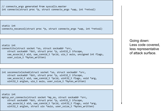 The buggy function in question is mptcp_usr_connectx. Moving up the call stack, we find the connectx syscall, which we see in Ian’s original testcase. If we were to write a fuzzer to find this bug, how would we do it? Ultimately, whatever we do has to both find the bug and give us the information we need to reproduce it on the real kernel. Calling mptcp_usr_connectx directly should surely find the bug, but this seems like the wrong idea because it takes a lot of arguments. Modeling a fuzzer well enough to call this function directly in a way representative of the real code is no easier than auditing the code in the first place, so we’ve not made things any easier by writing a targeted fuzzer. It’s also wasted effort to write a target for each function this small. On the other hand, the further up the call stack we go, the more complexity we may have to support and the less chance we have of landing on the bug. If I were trying to unit test the networking stack, I would probably avoid the syscall layer and call the intermediate helper functions as a middle ground. This is exactly what I tried in the first draft of the fuzzer; I used sock_socket to create struct socket* objects to pass to connectitx in the hopes that it would be easy to reproduce this bug while being high-enough level that this bug could plausibly have been discovered without knowing where to look for it. Surprisingly, after some experimentation, it turned out to be easier to simply call the syscalls directly (via connectx). This makes it easier to translate crashing inputs into programs to run against a real kernel since testcases map 1:1 to syscalls. We’ll see more details about this later.