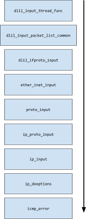We can’t test networking properly without accounting for packets. In this case, data comes from the hardware, not via syscalls from a user process. We’ll have to expose this functionality to our fuzzer. To figure out how to extend our framework to support random packet delivery, we can use our next example bug. Let’s take a look at the call stack for delivering a packet to trigger the ICMP bug reported by Kevin Backhouse: