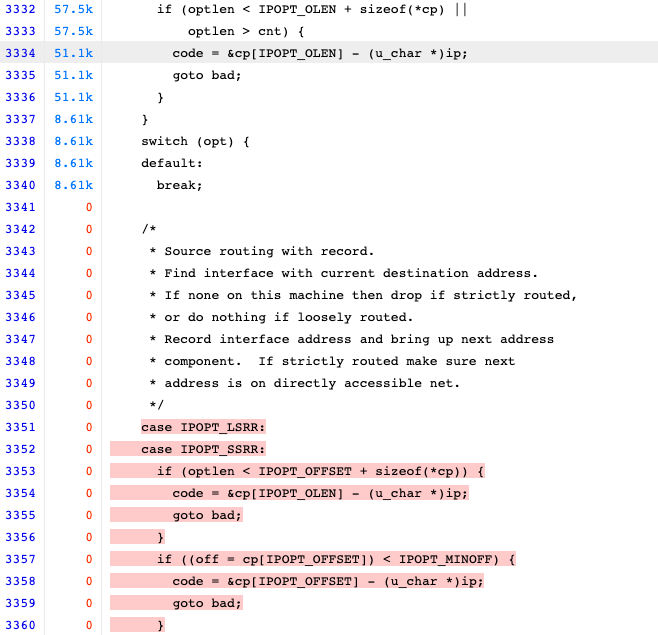 This excerpt from IP option handling shows that we don’t support the various packets well with the current version of the fuzzer and grammar. Having this visualization is enormously helpful and necessary to succeed, as it is a source of truth about your fuzz target. By directing development work around these reports, it’s relatively easy to plan actionable and high-value tasks around the fuzzer.