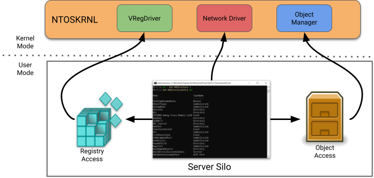While just doing basic inspection has been surprisingly fruitful it was likely to need some reverse engineering to shake out anything else. I know from previous experience on Desktop Bridge how the registry overlays and object manager redirection works when combined with silos. In the case of Desktop Bridge it uses application silos rather than server silos but they go through similar approaches.