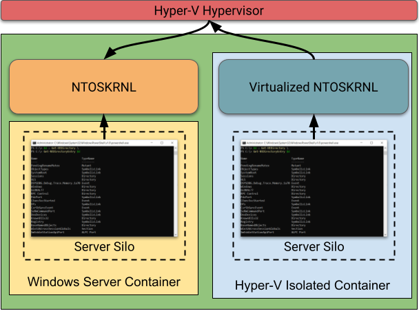 Hyper-V Isolated Containers still run in a server silo, but do so in a separate lightweight VM. You can still use the same kernel vulnerability to escape the server silo, but you’re still constrained by the VM and hypervisor. To fully escape and access the host you’d need a separate VM escape as well.